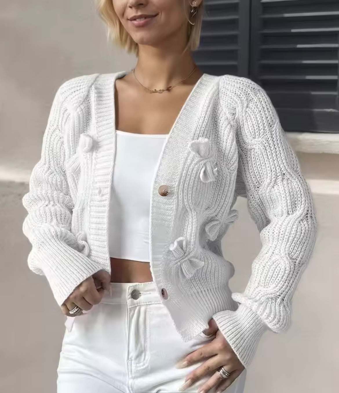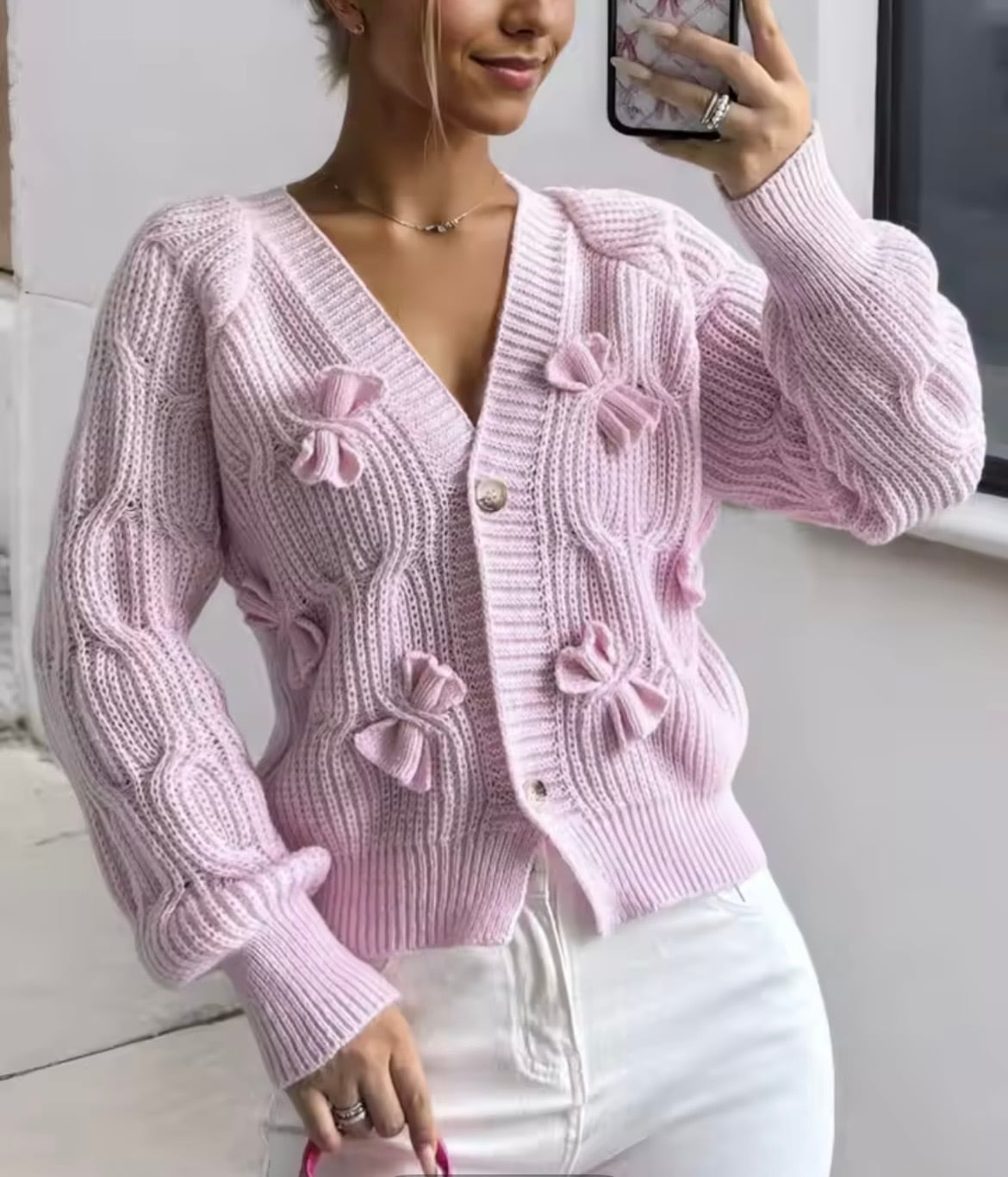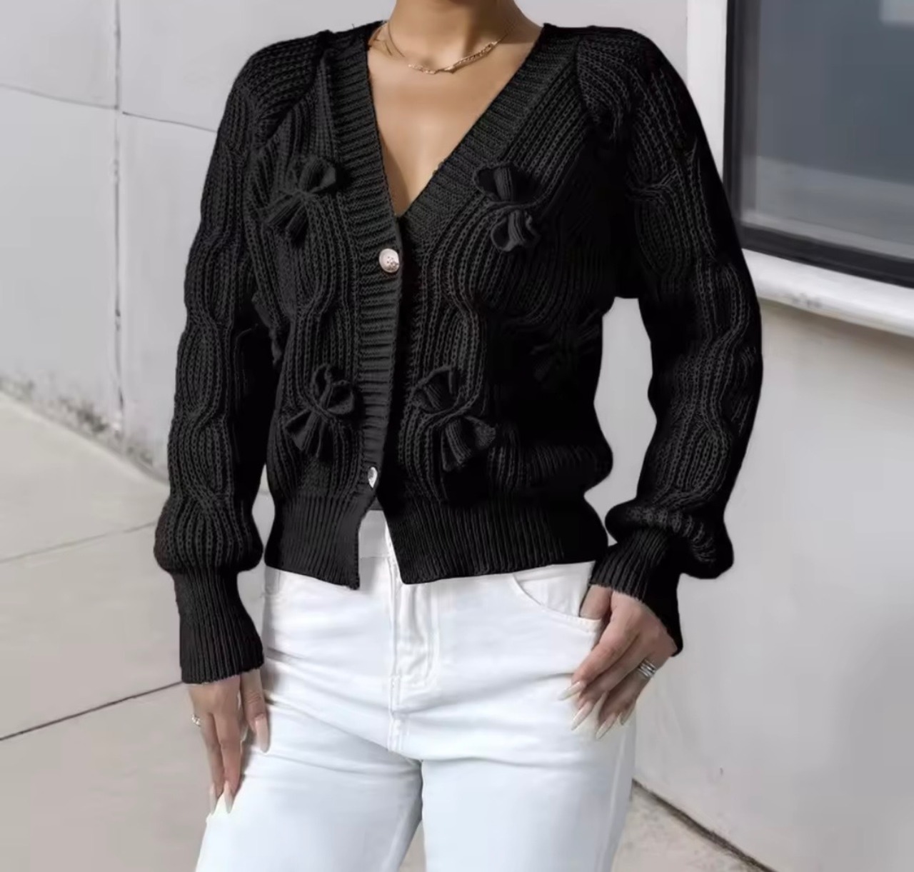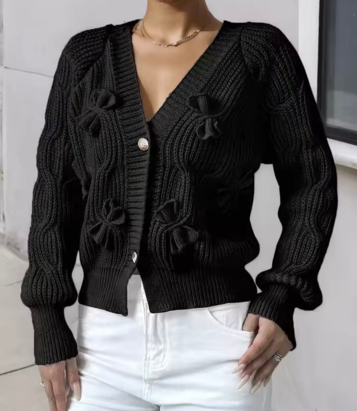 リボンデザインのニットカーディガン。