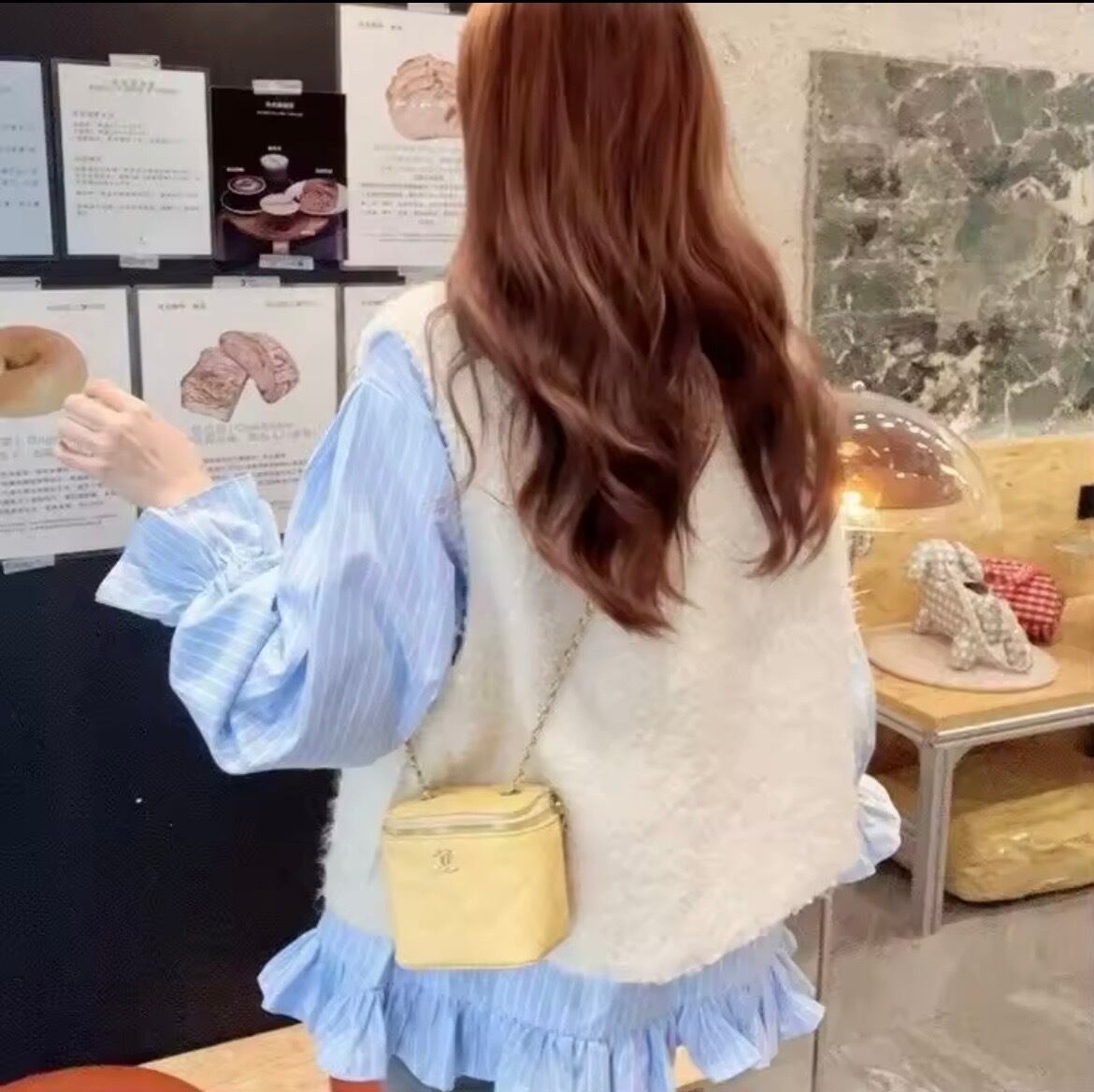 ファーベスト合わせやカーディガン合わせにもフリルが映えるブラウスです。