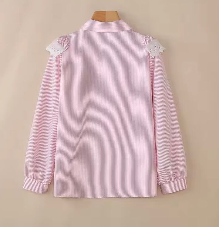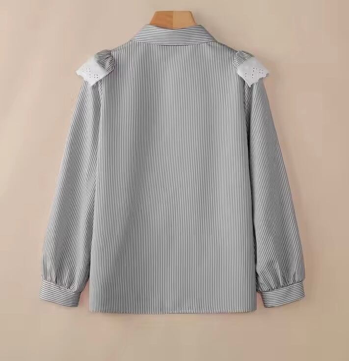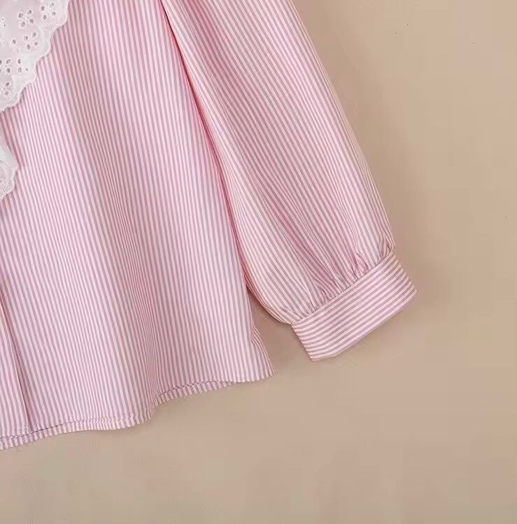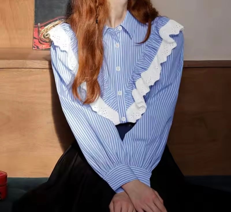 シンプルなデニムスタイルにもレースとストライプが映えるトップスです。