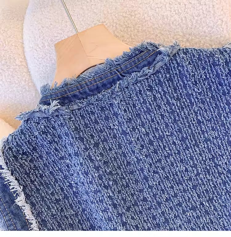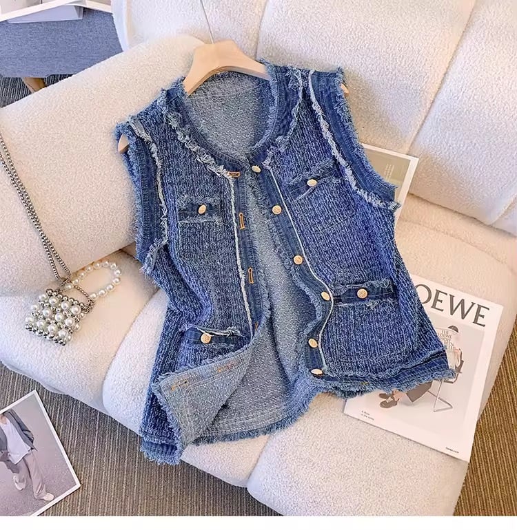 デニムカラーが、どんなインナーにも合わせてお使い頂けるツイードジレ。