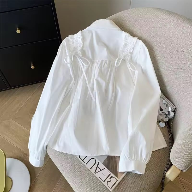 バックスタイルにもフリルリボンがデザインされ、カジュアルなスタイリングにも映えるブラウスです。