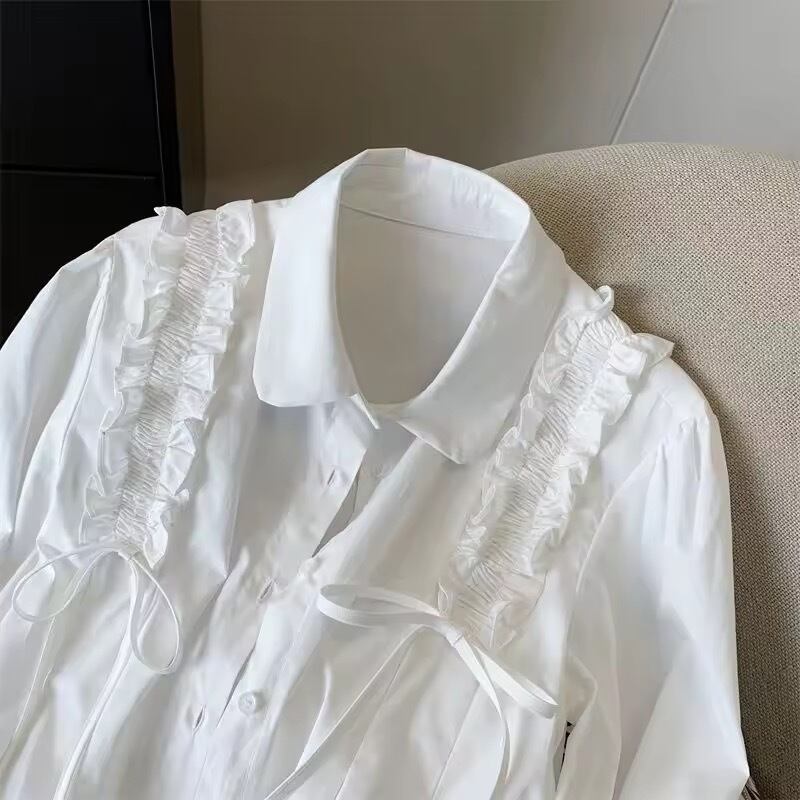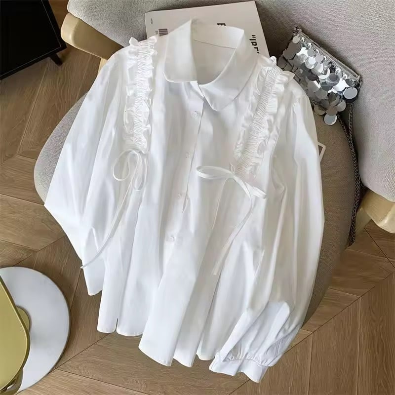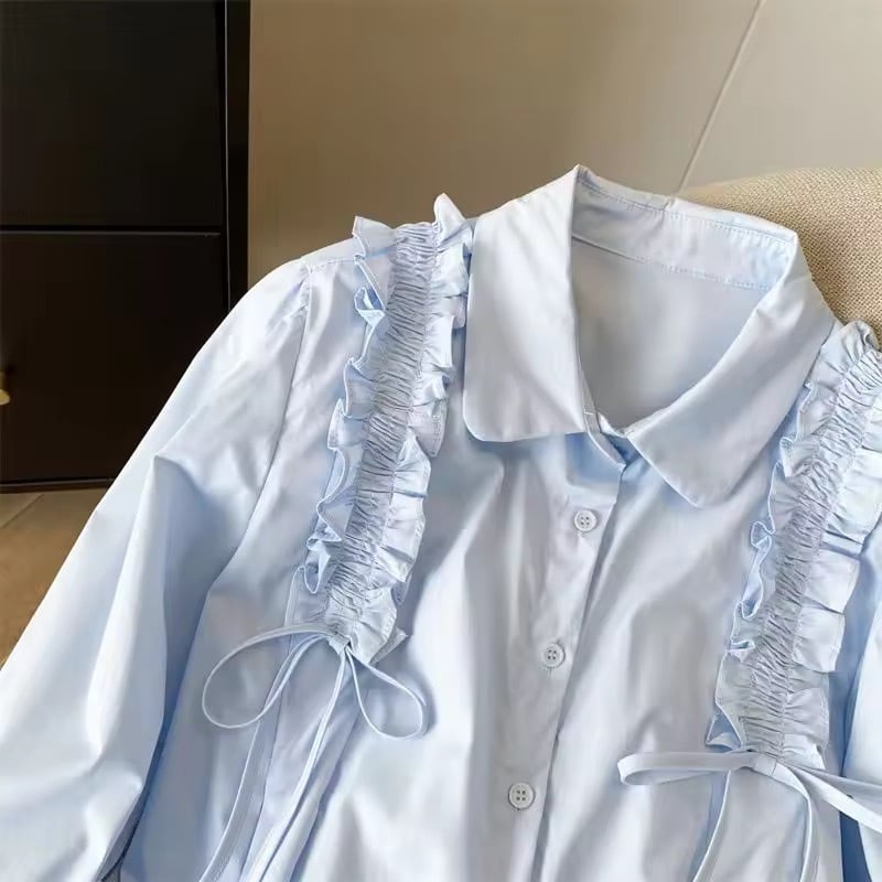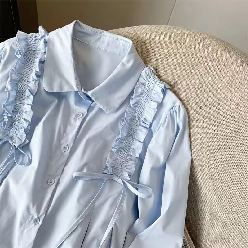 ショルダーフリルにリボンがデザインされたブラウス。