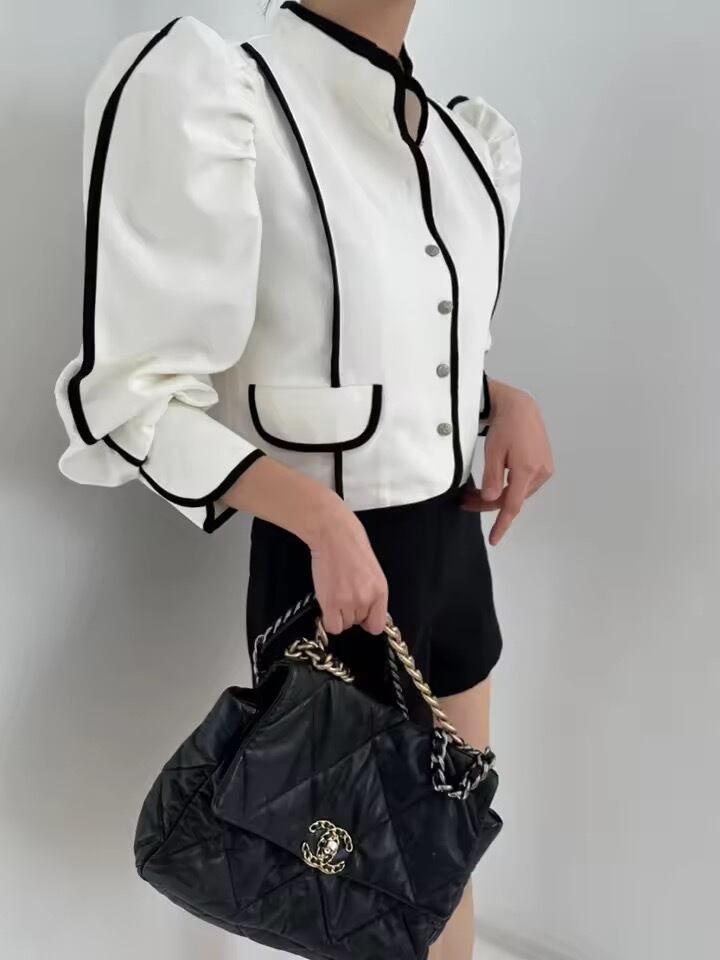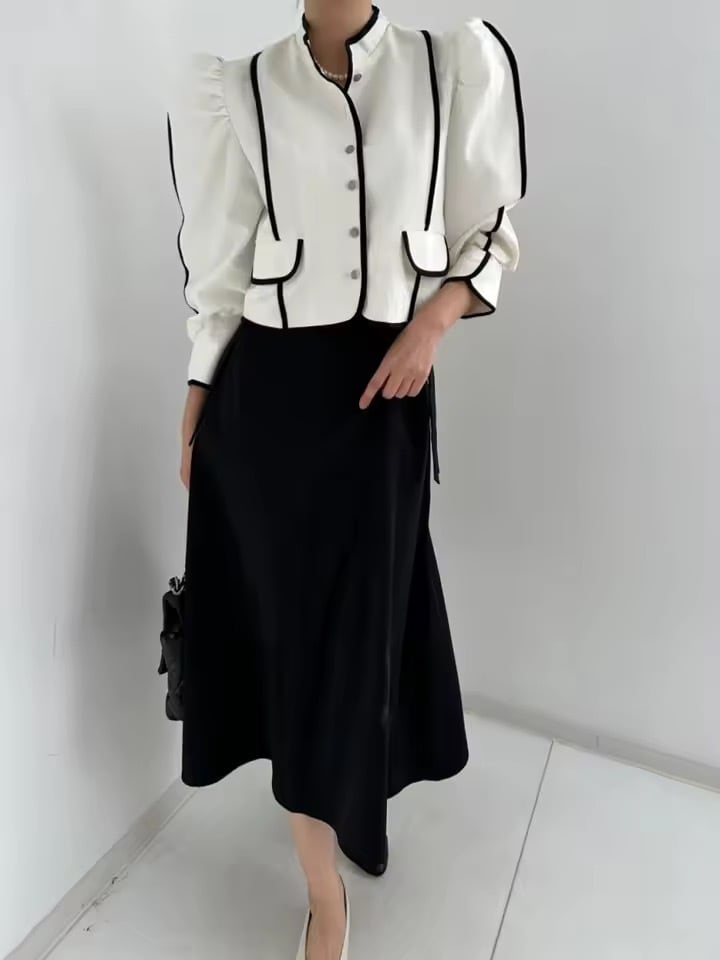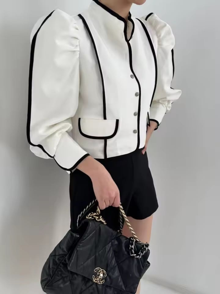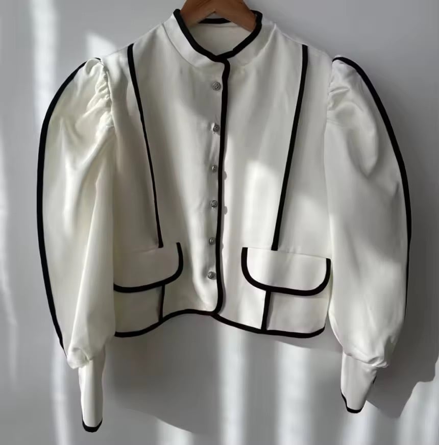 パフショルダーと配色デザインがポイントのジャケットトップス。