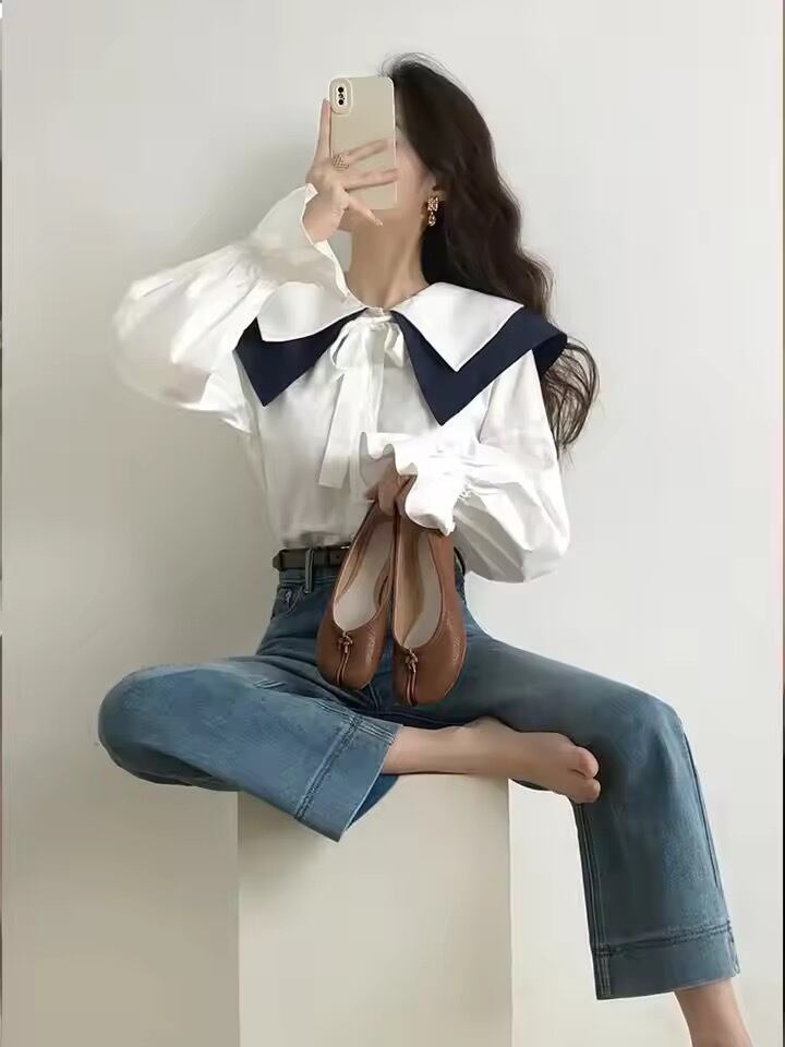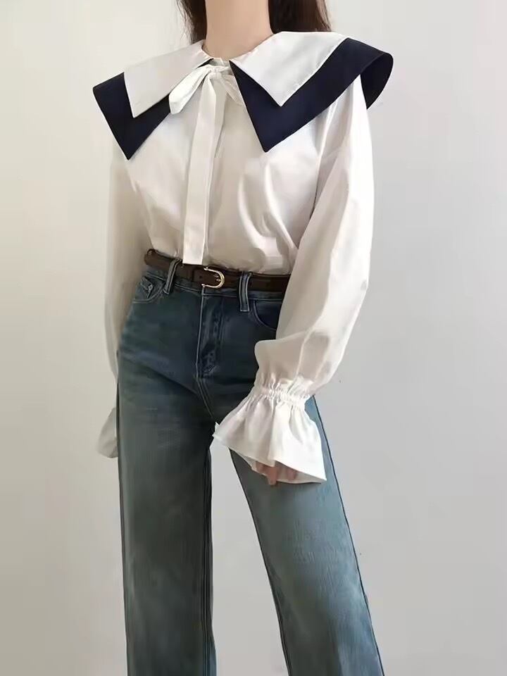 配色ダブルカラーにリボンデザインのブラウス。