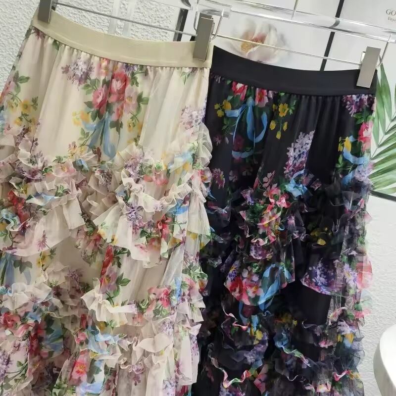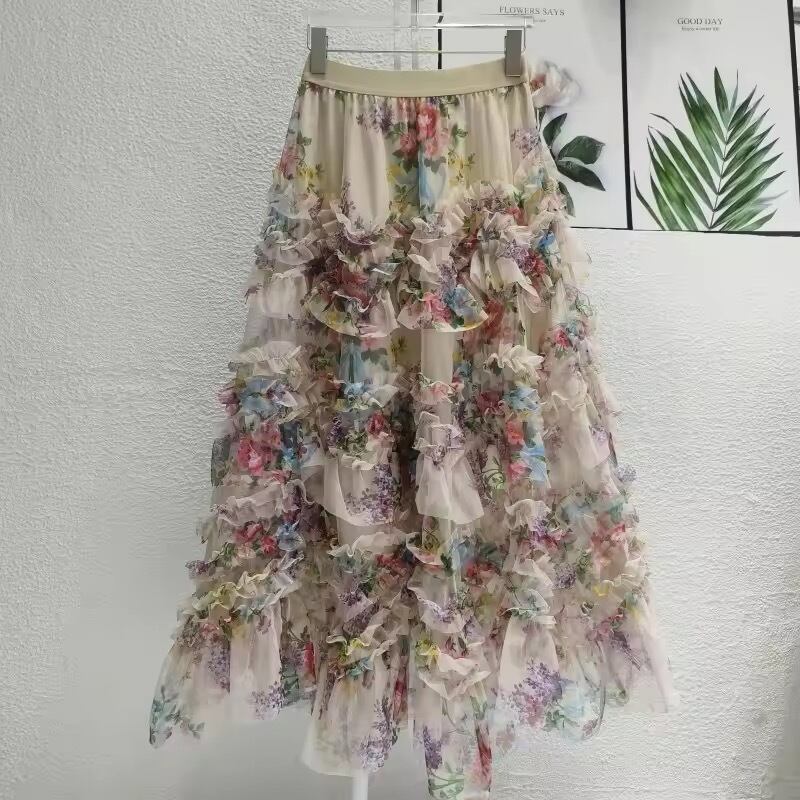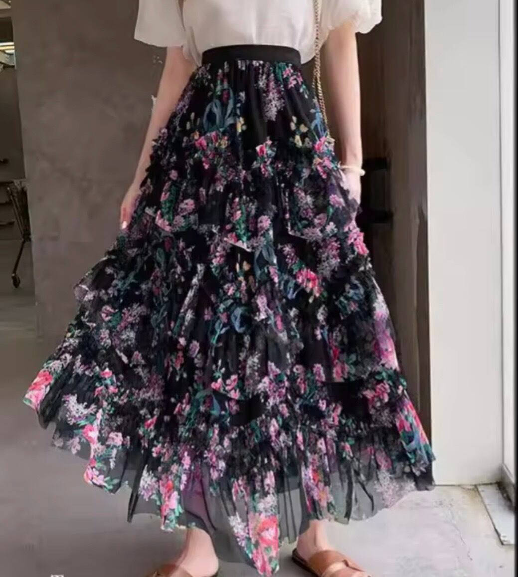 フラワーデザインが華やかなフリルチュールスカート。