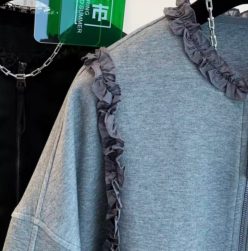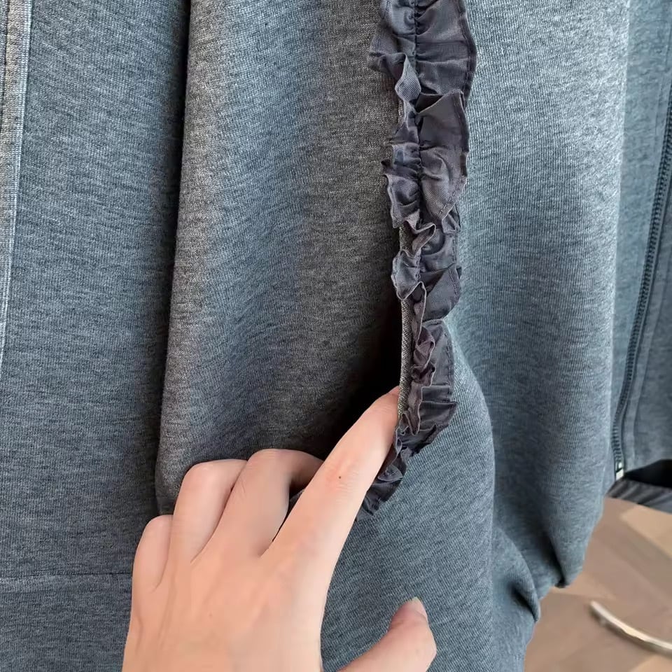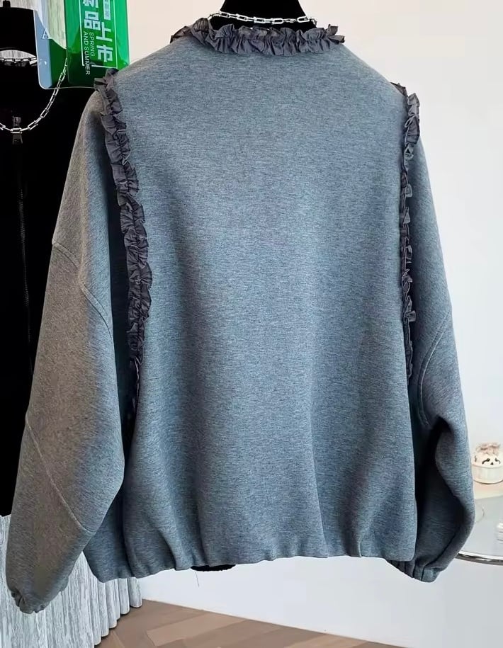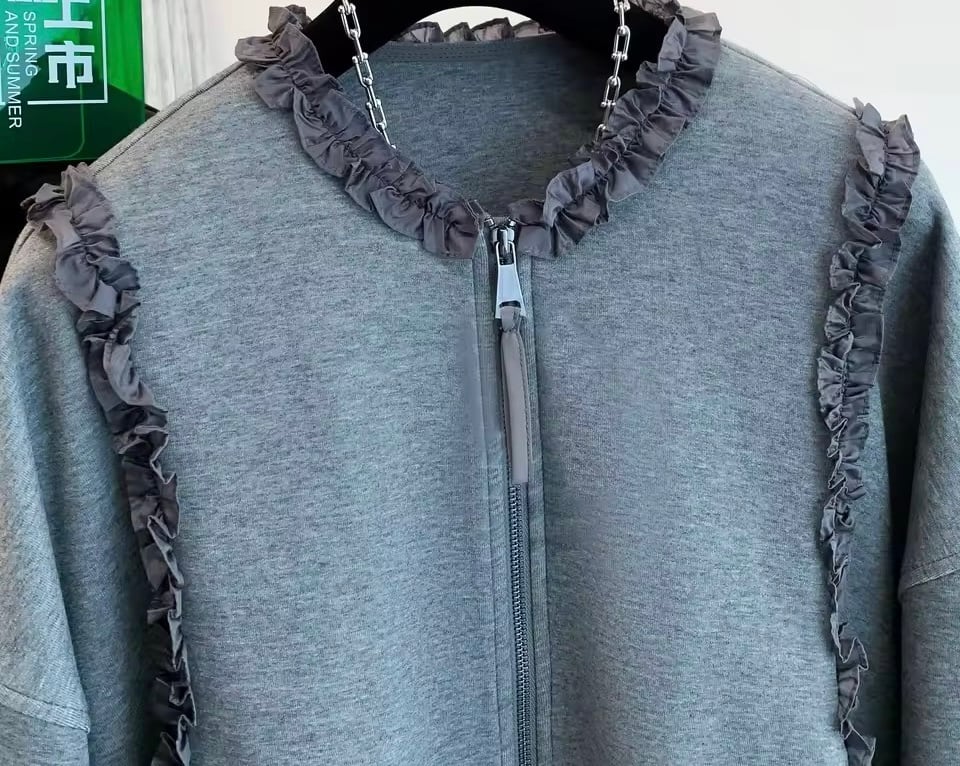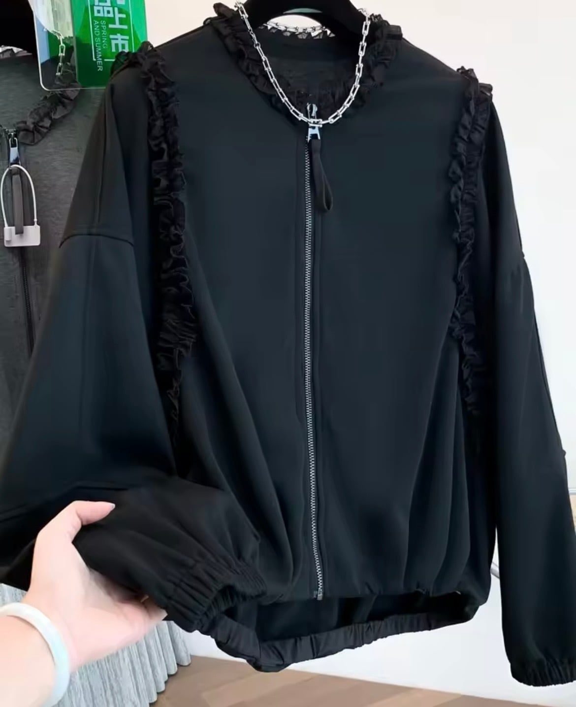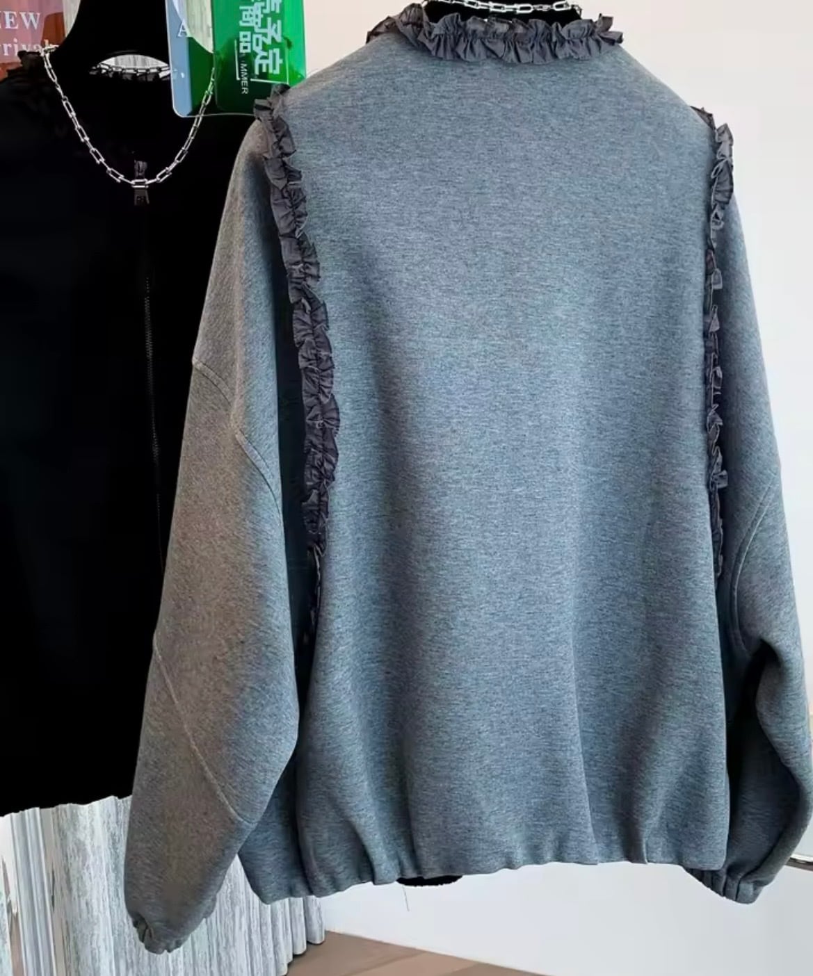 カジュアルなスタイリングにも、フリルがフェミニンさをプラスするアウターです。