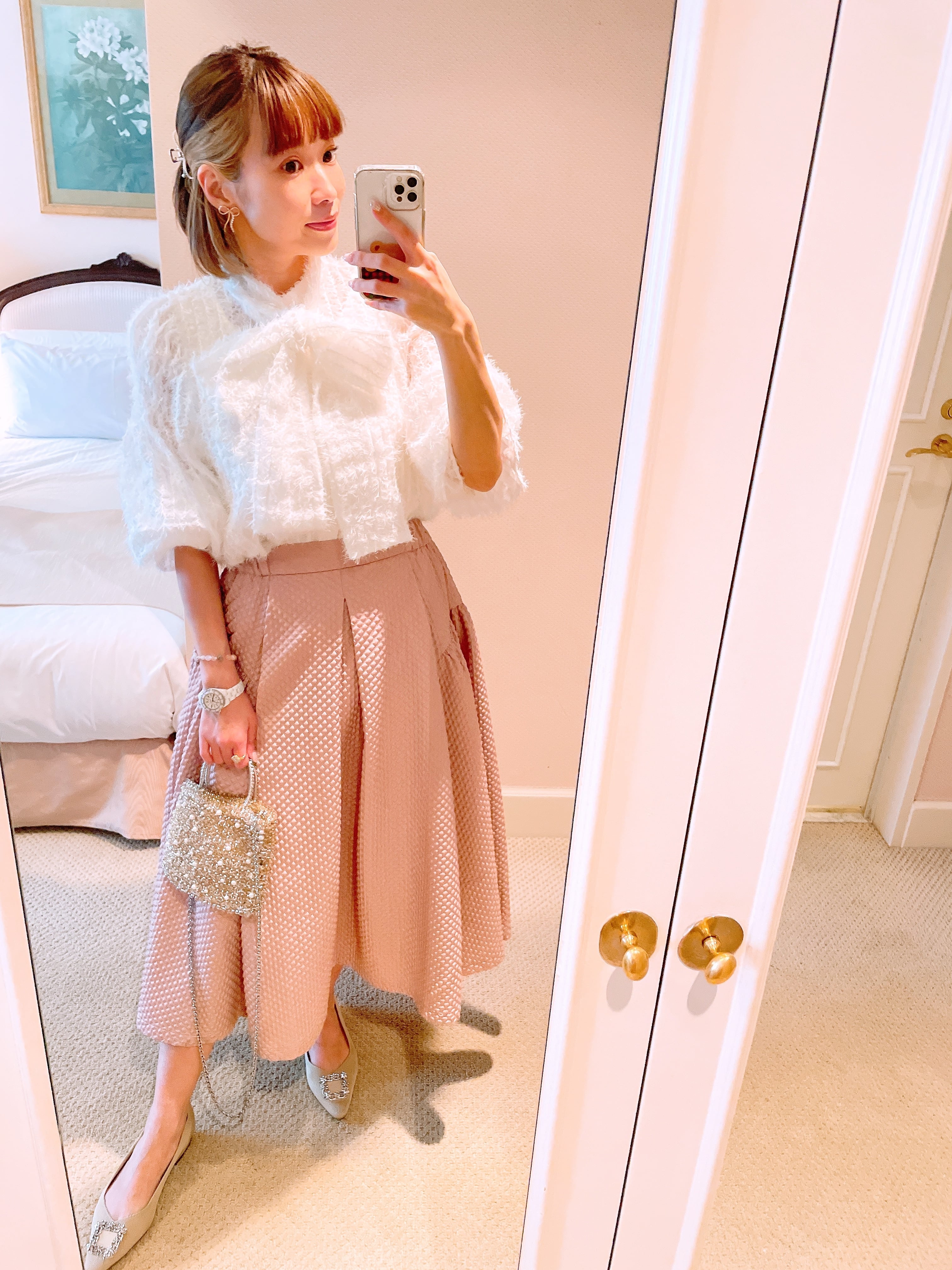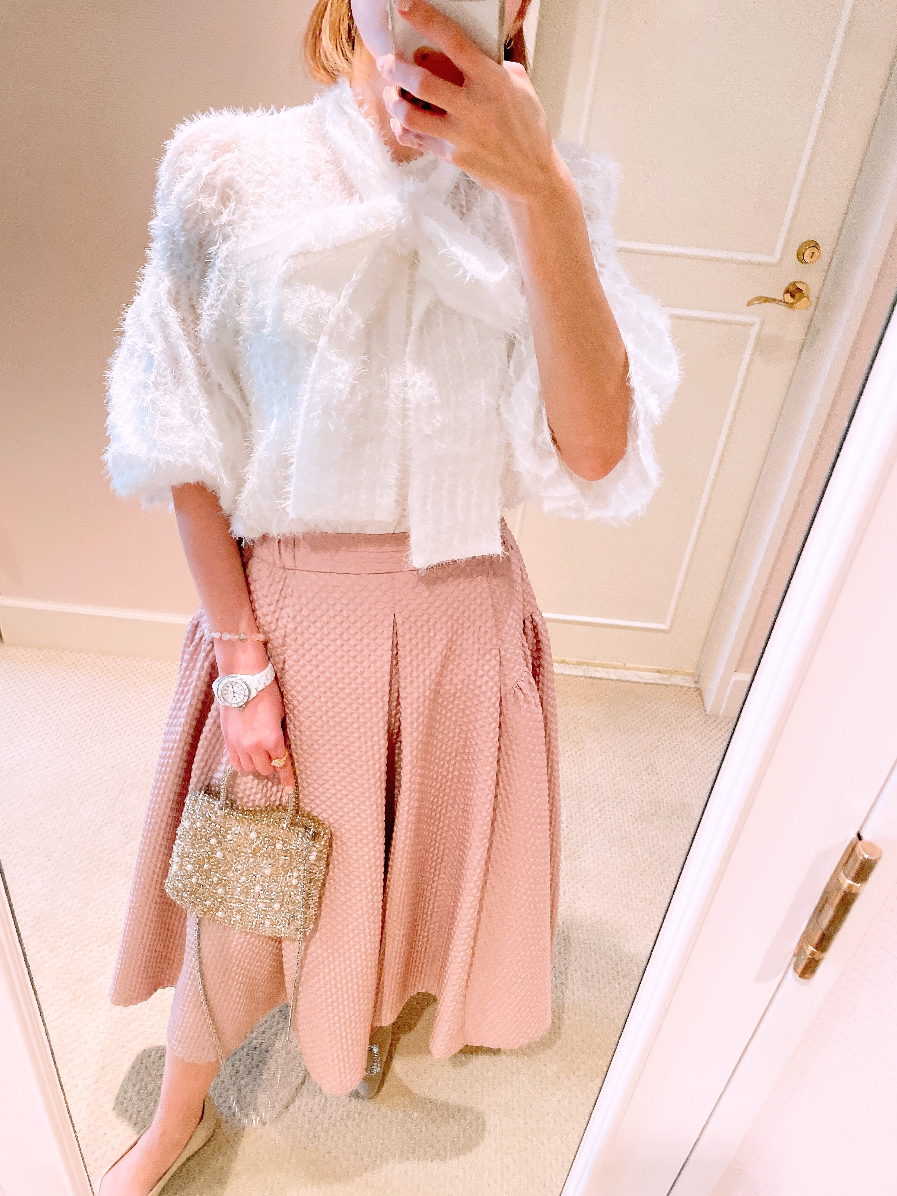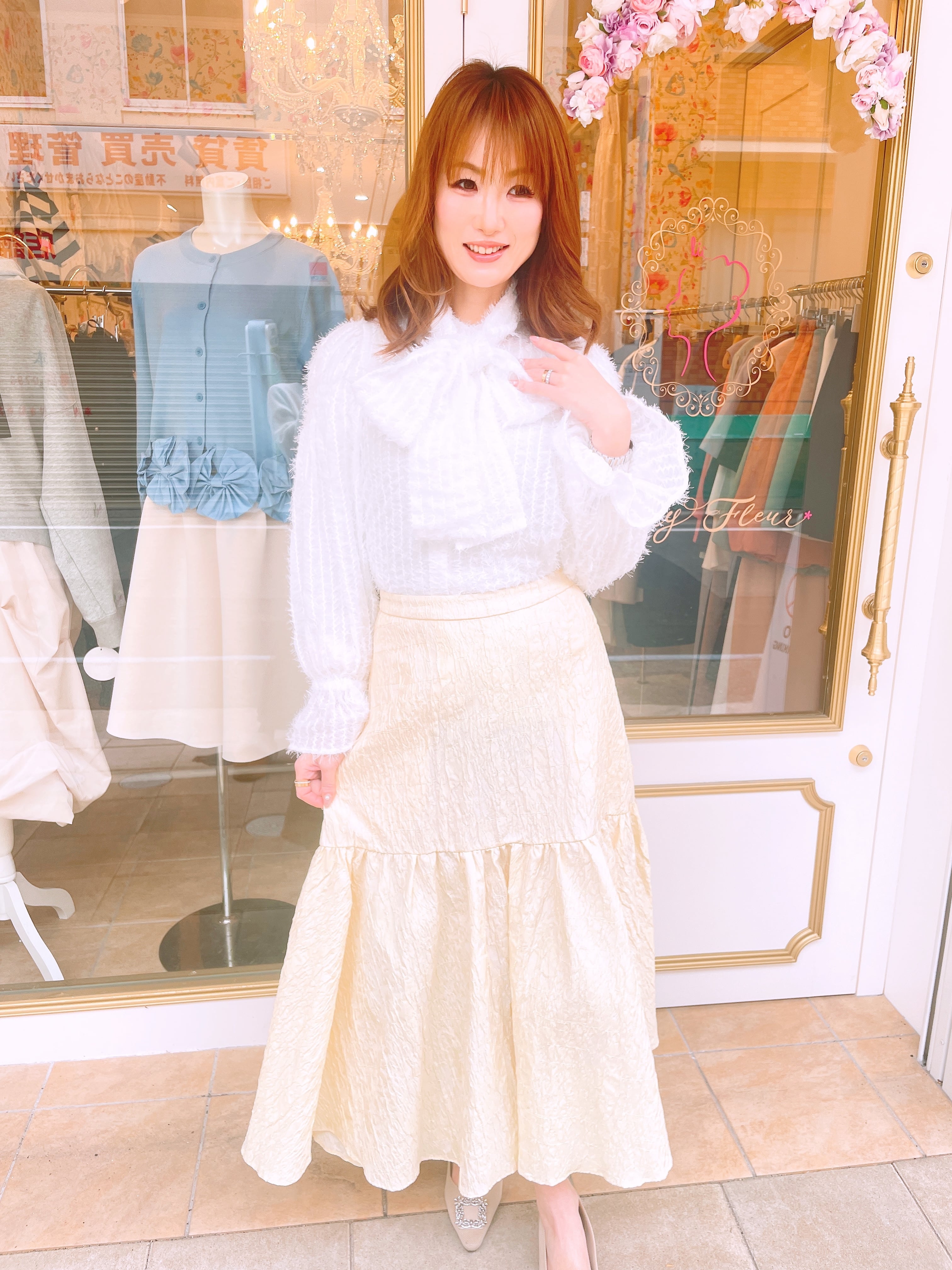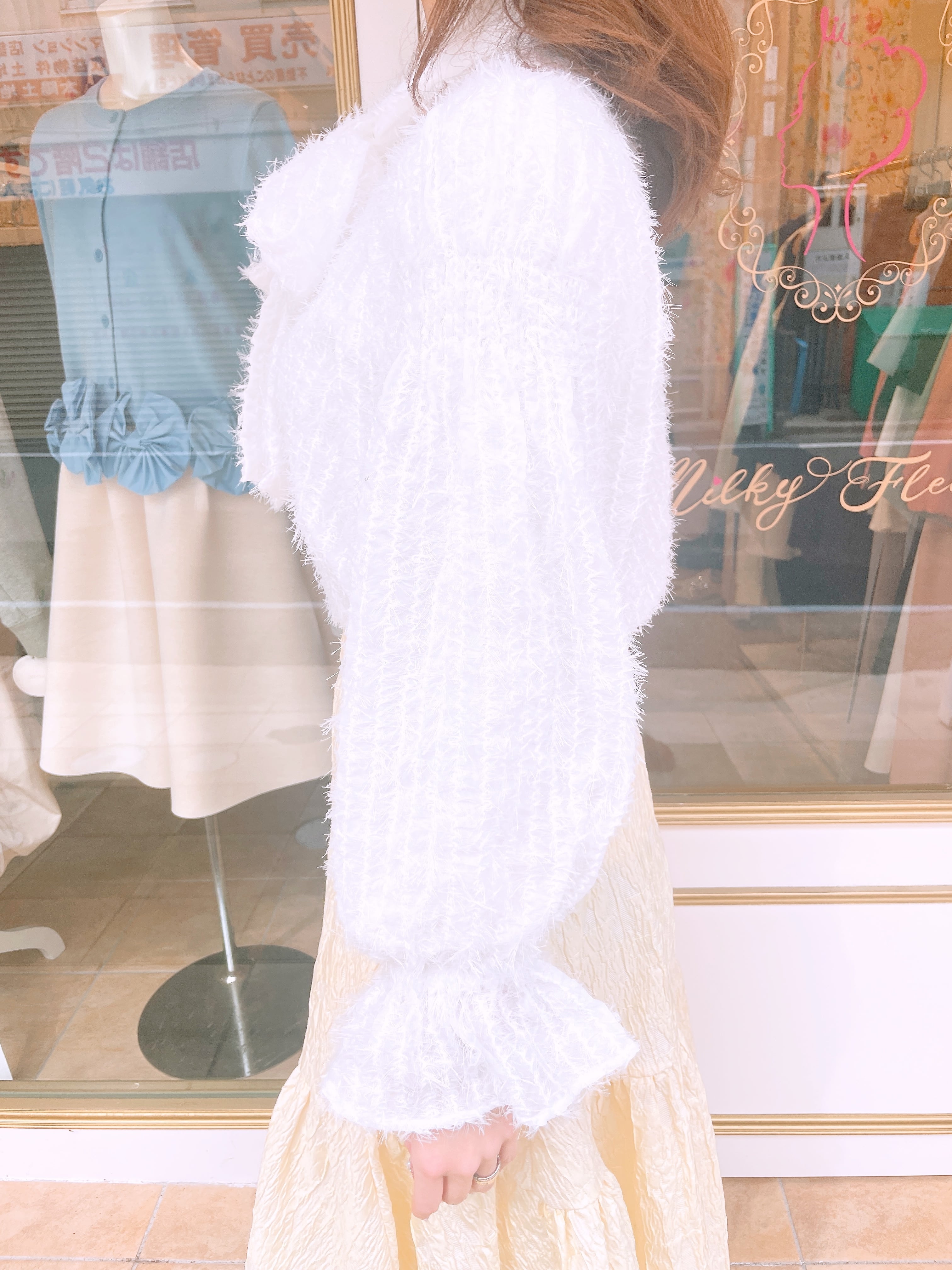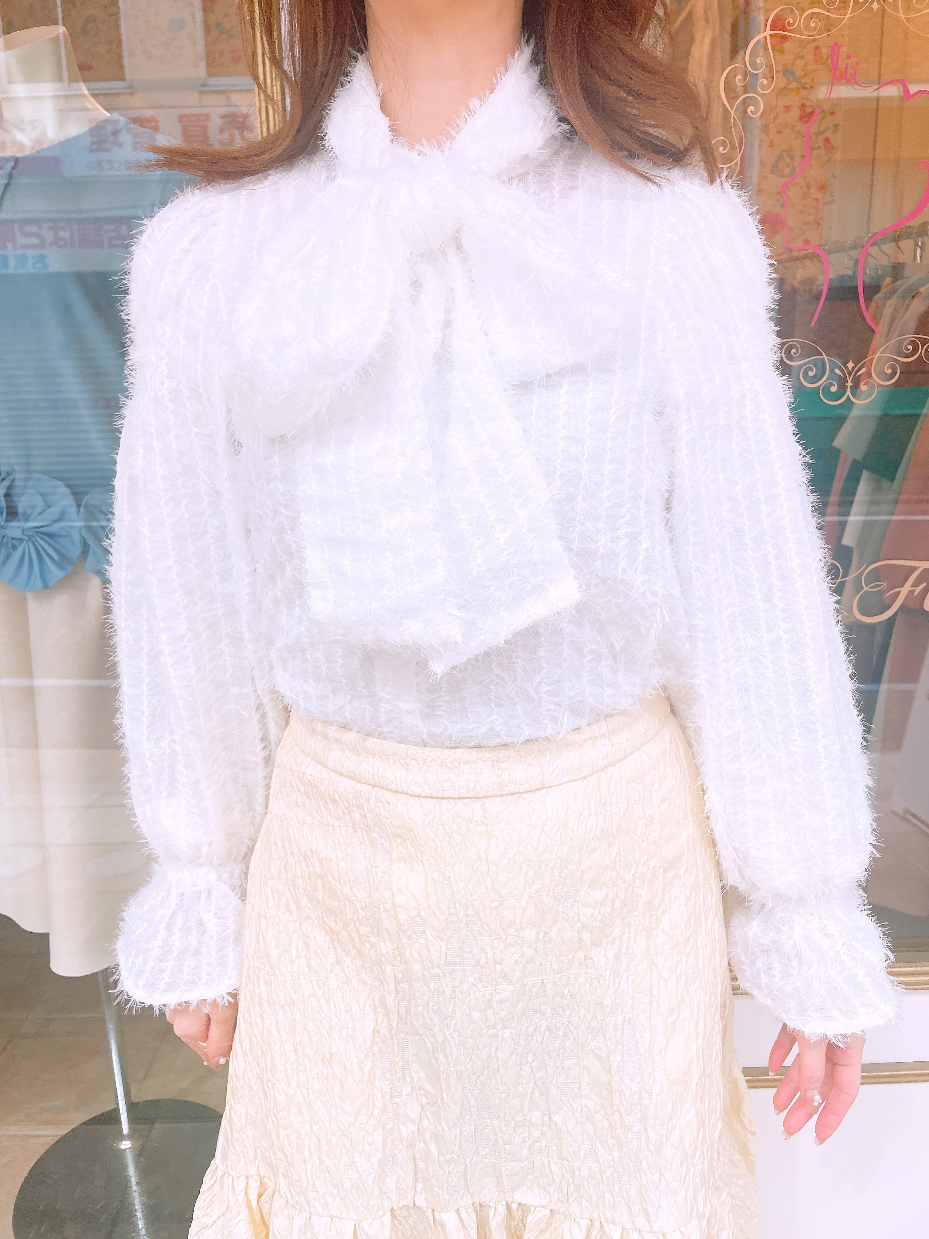 付属の同生地リボンを結べば、印象がぐっと華やかに。外せばシンプルで大人っぽい雰囲気になり、着こなしの幅が広がります。