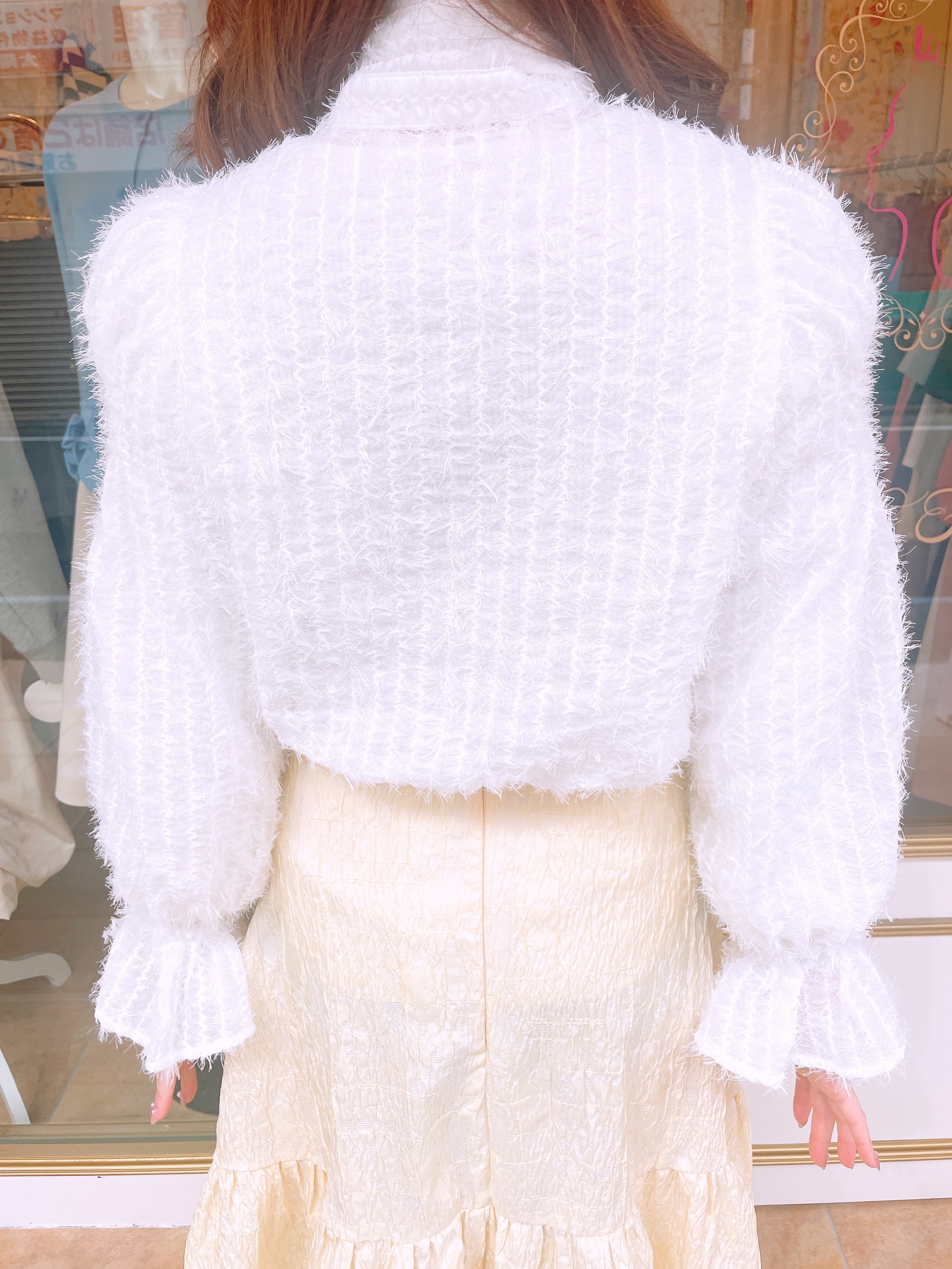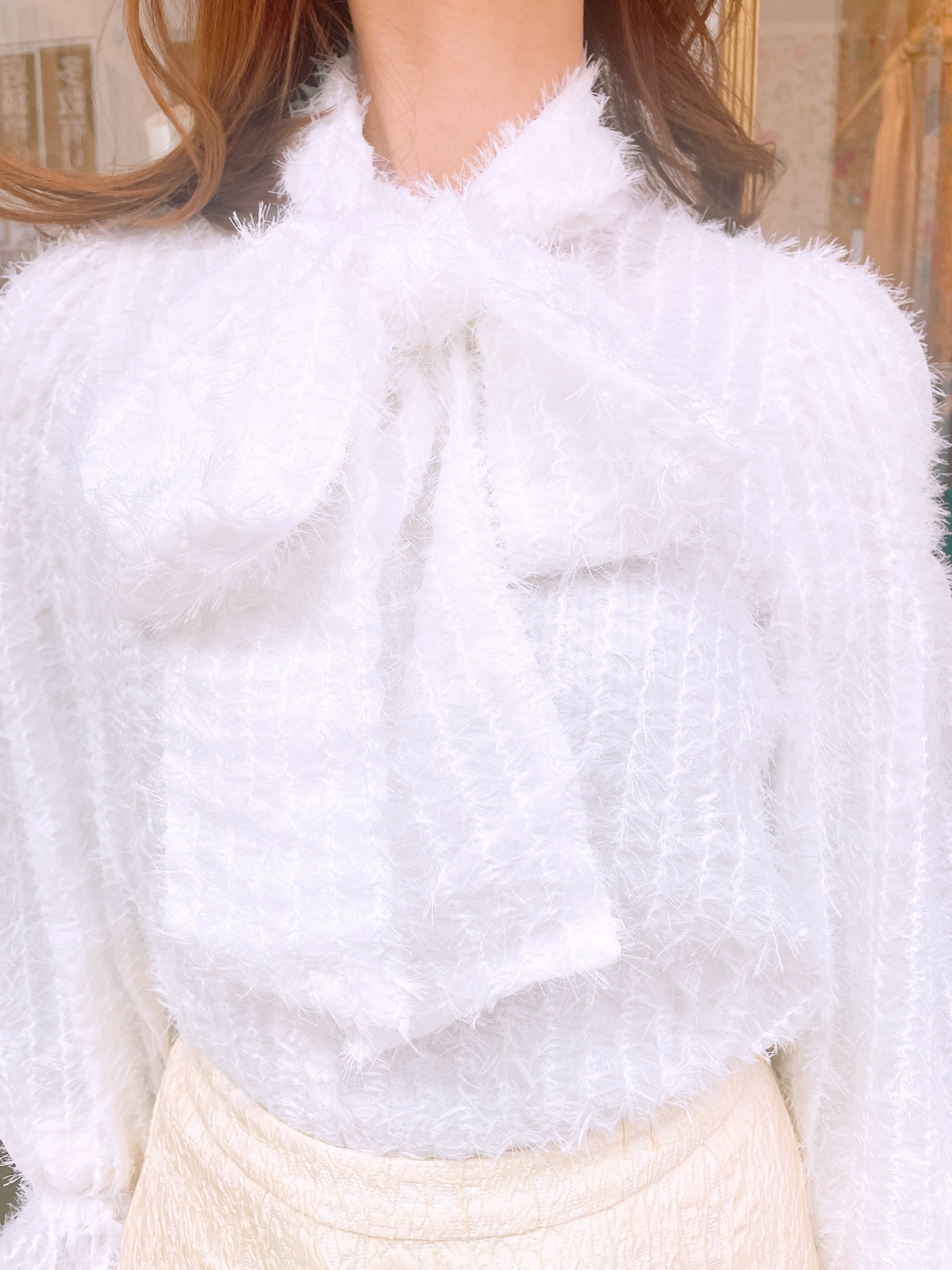 特殊なシアー生地を使い、フリンジのような立体的な毛羽立ちと優しい肌触りが特徴の一枚です。