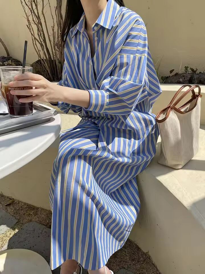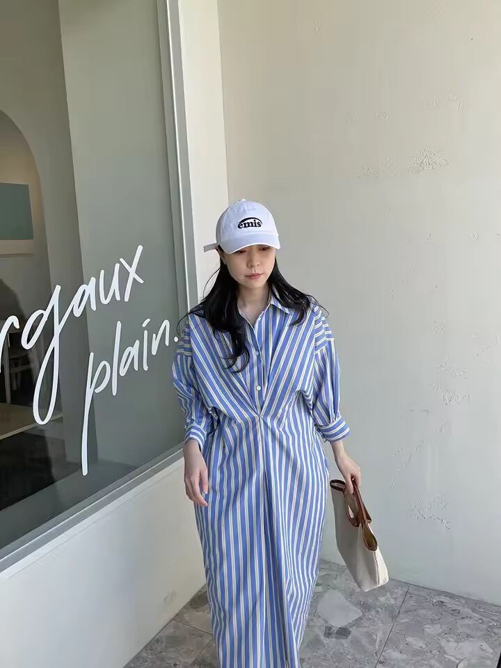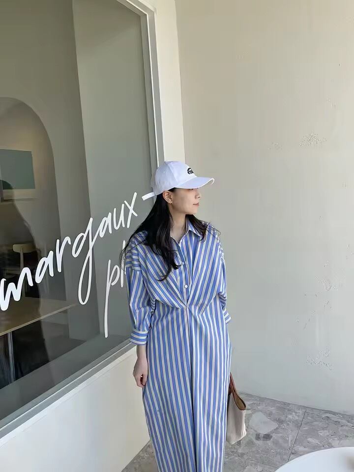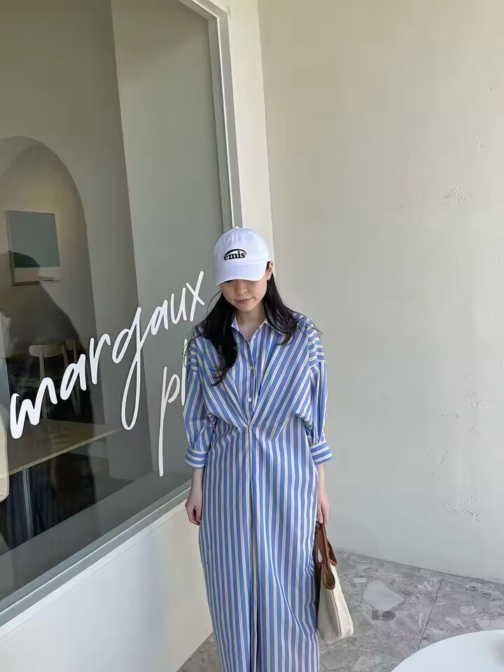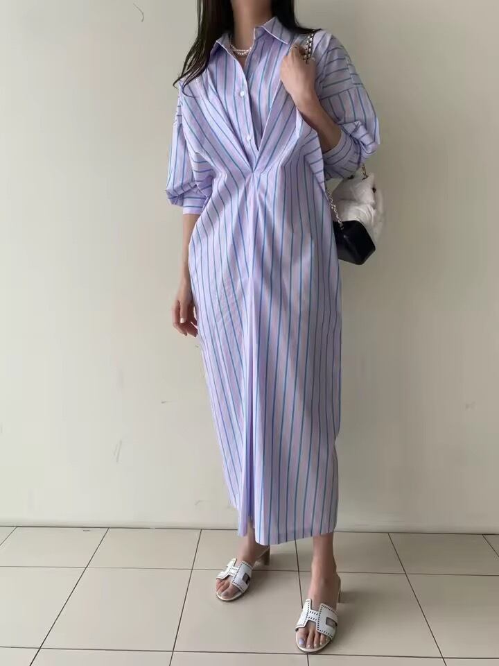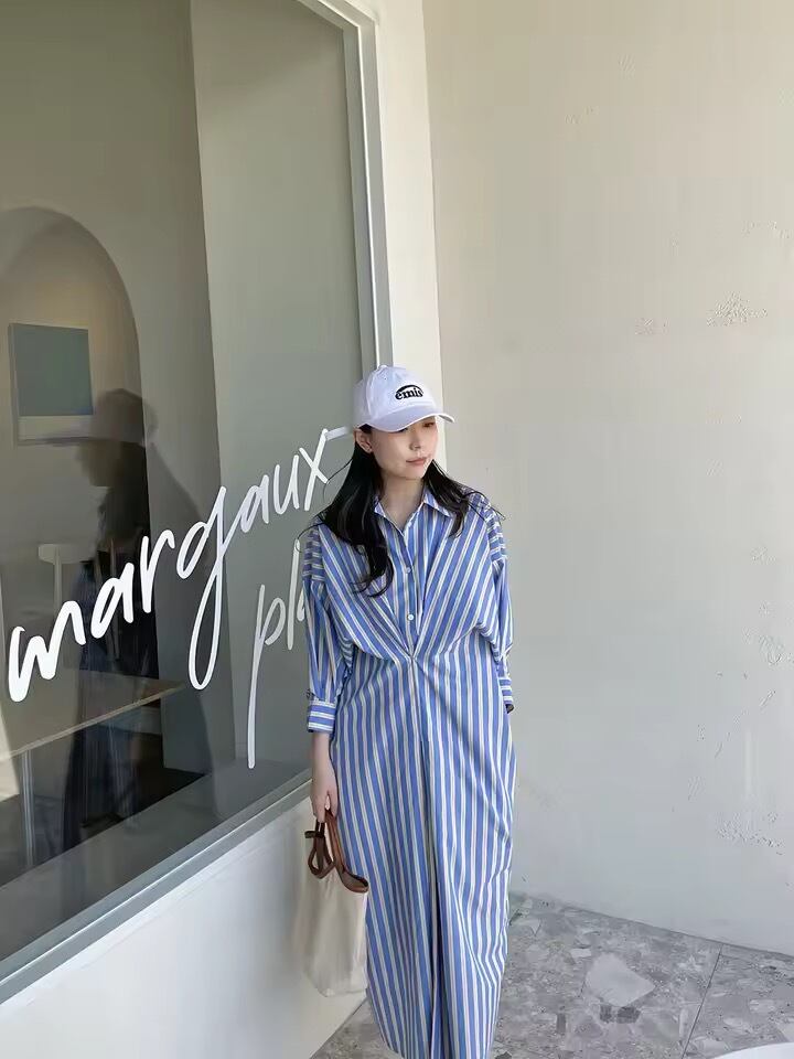 フロントのタックがスタイルアップを叶えるストライプシャツワンピース。