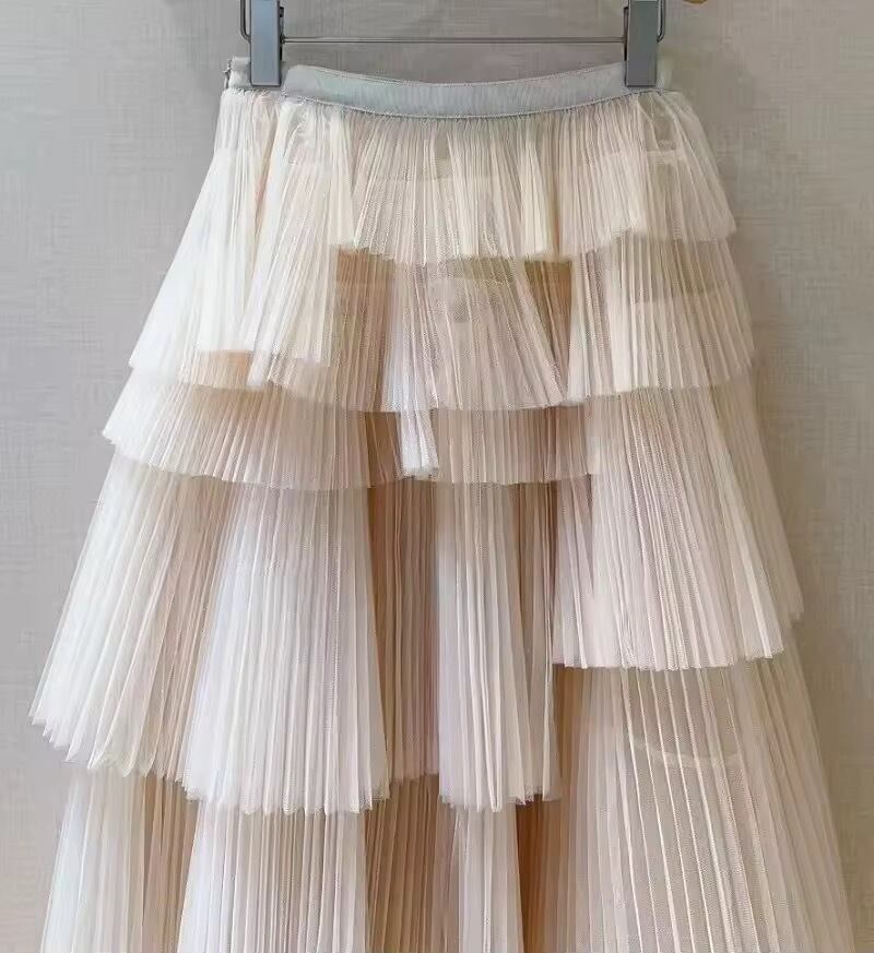 アシンメトリーにデザインされた、ティアードプリーツスカート。