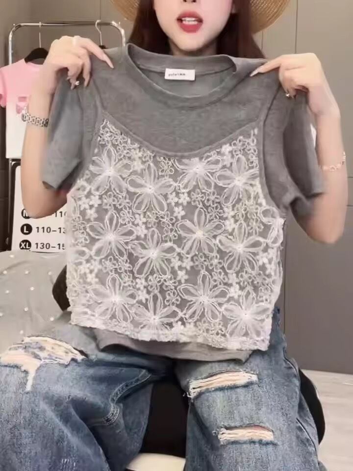 フラワーレースのキャミソールがドッキングデザインになった、重ね着風Tシャツ。