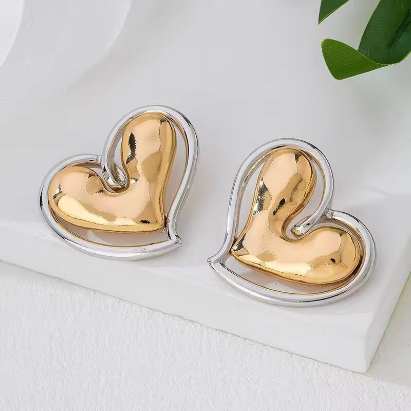 ゴールドの立体ハートにシルバーの配色デザインのピアス。