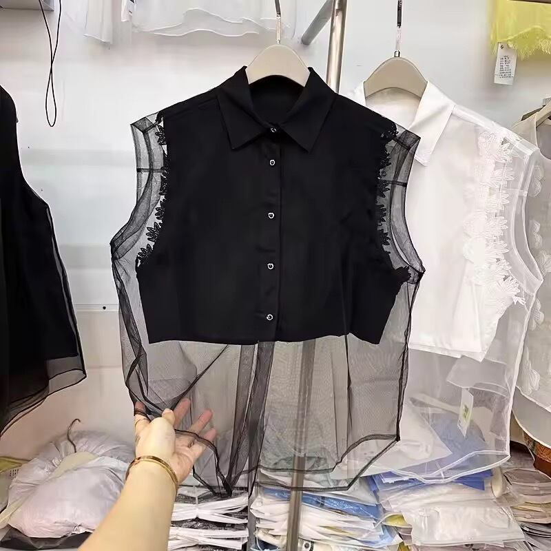 レーススリーブのブラウスにシアーなお素材がレイヤードされたブラウス。