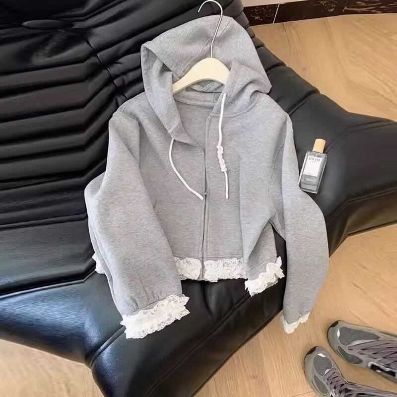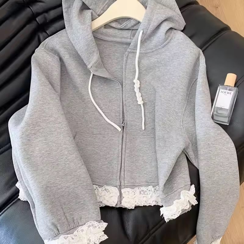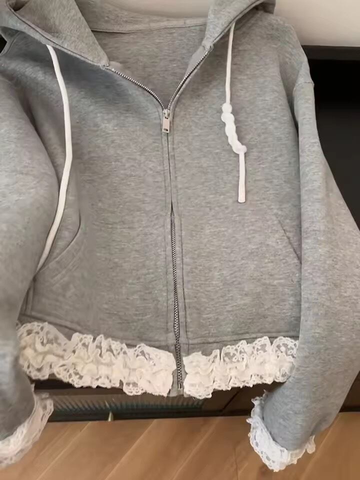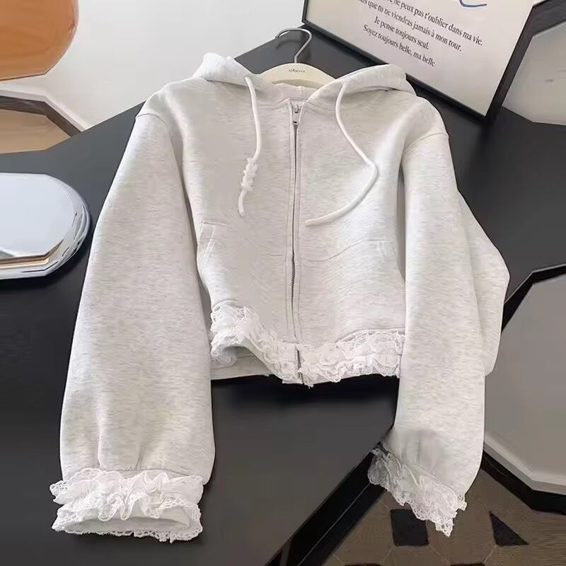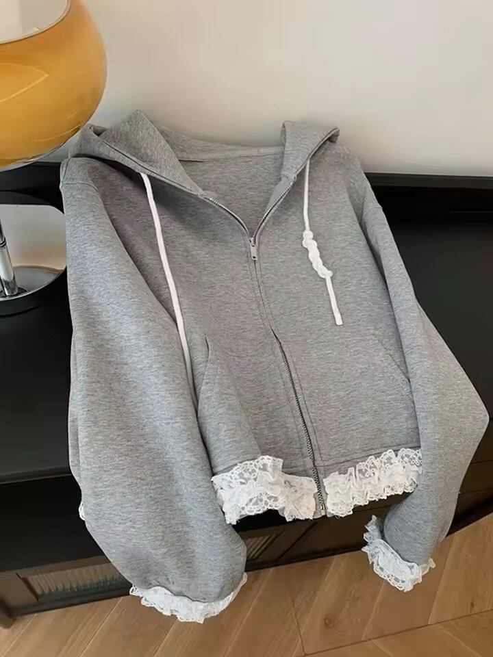 お袖と裾部分にデザインされたレースフリルがアクセントのパーカー。