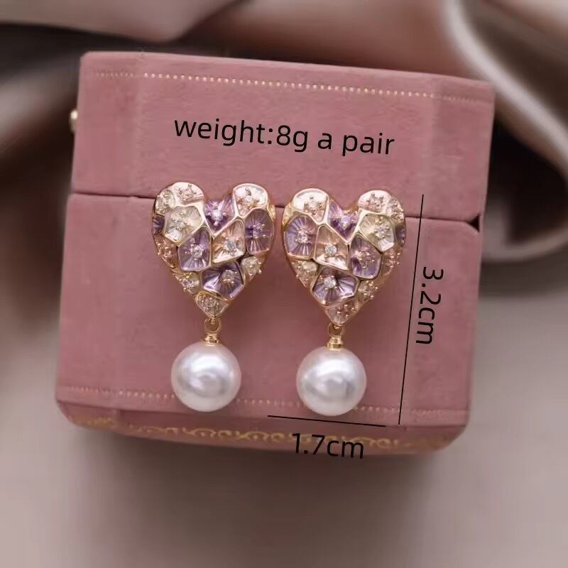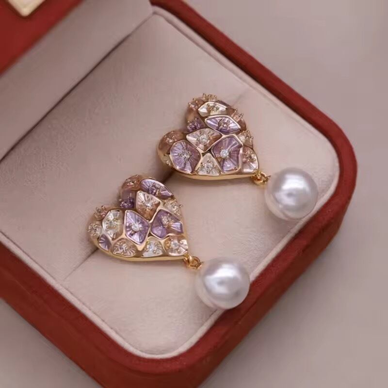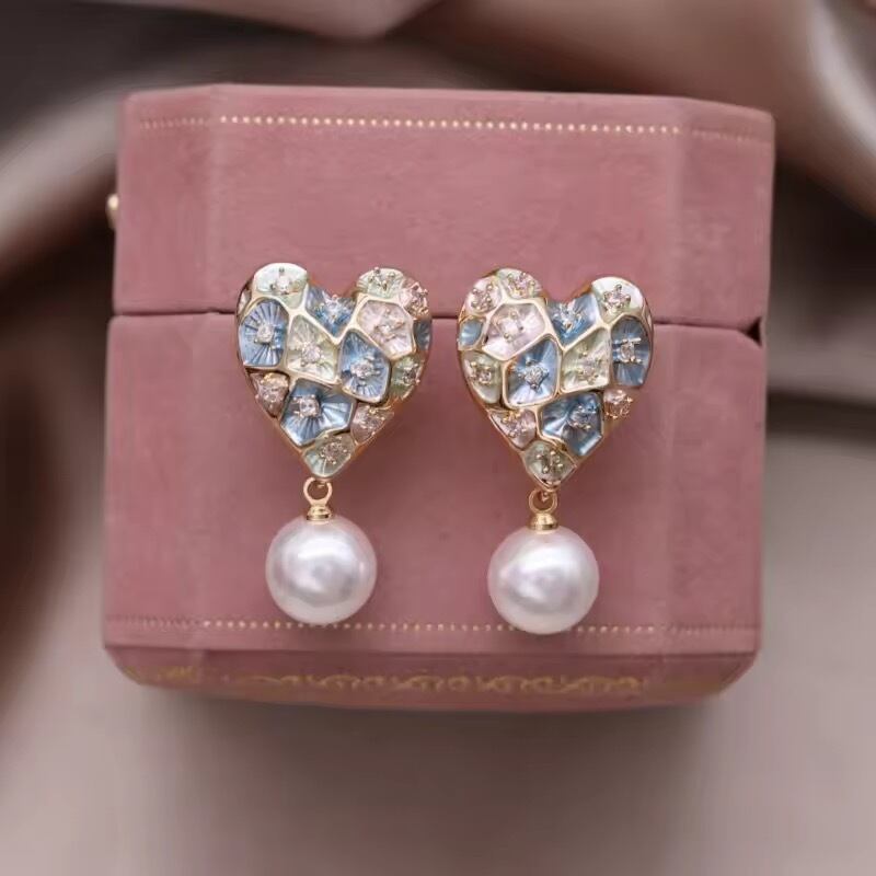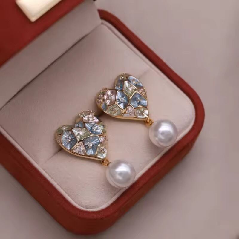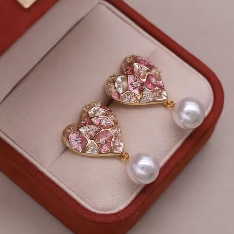 配色デザインのハートにビジューやパールがデザインされたピアス。