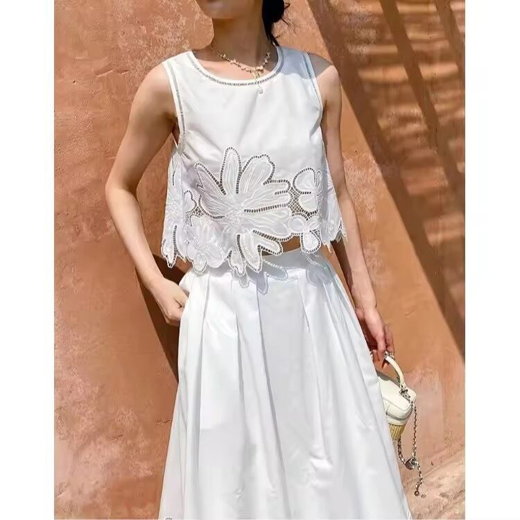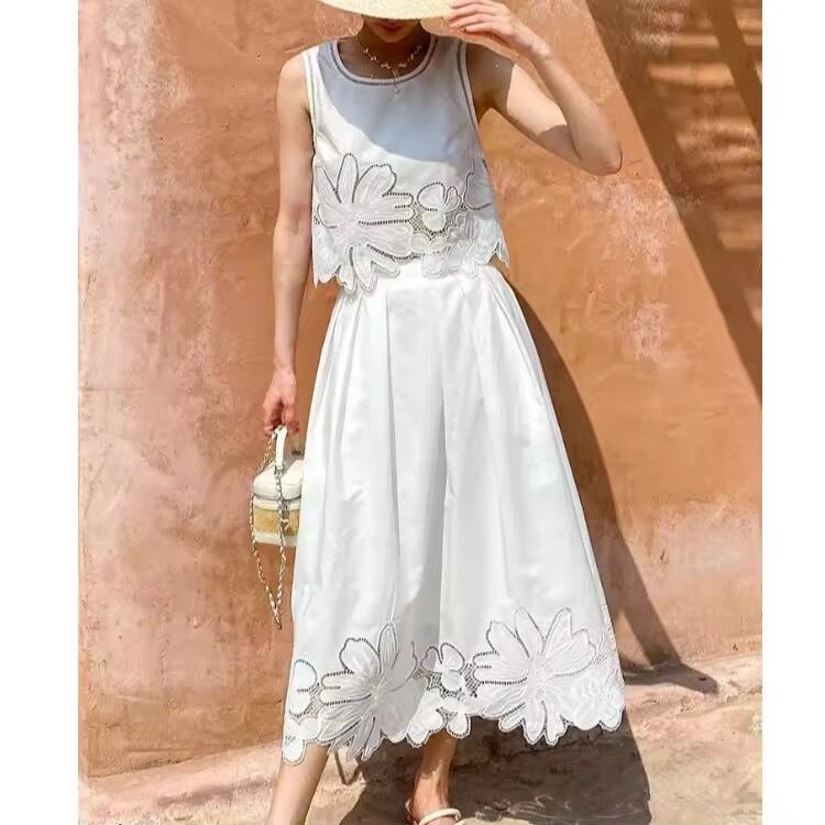 裾部分のフラワーレースが華やかなトップスとスカート。