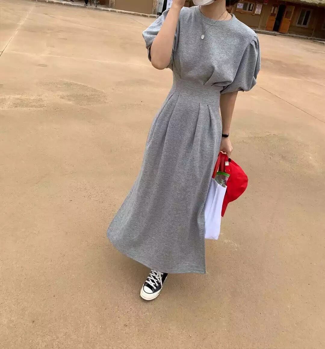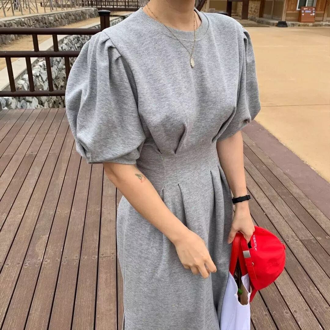 今期流行のパフスリーブワンピースがカジュアルなスウェットお素材に。