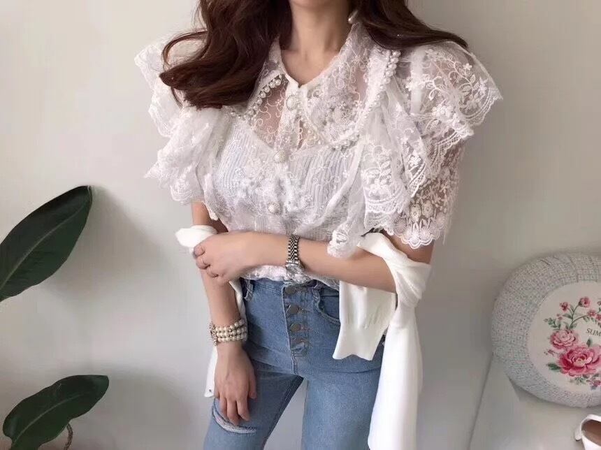 襟元やフロントにパールがデザインされたレースブラウス。