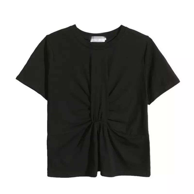 ギャザーがリボンのようにデザインされたTシャツ。