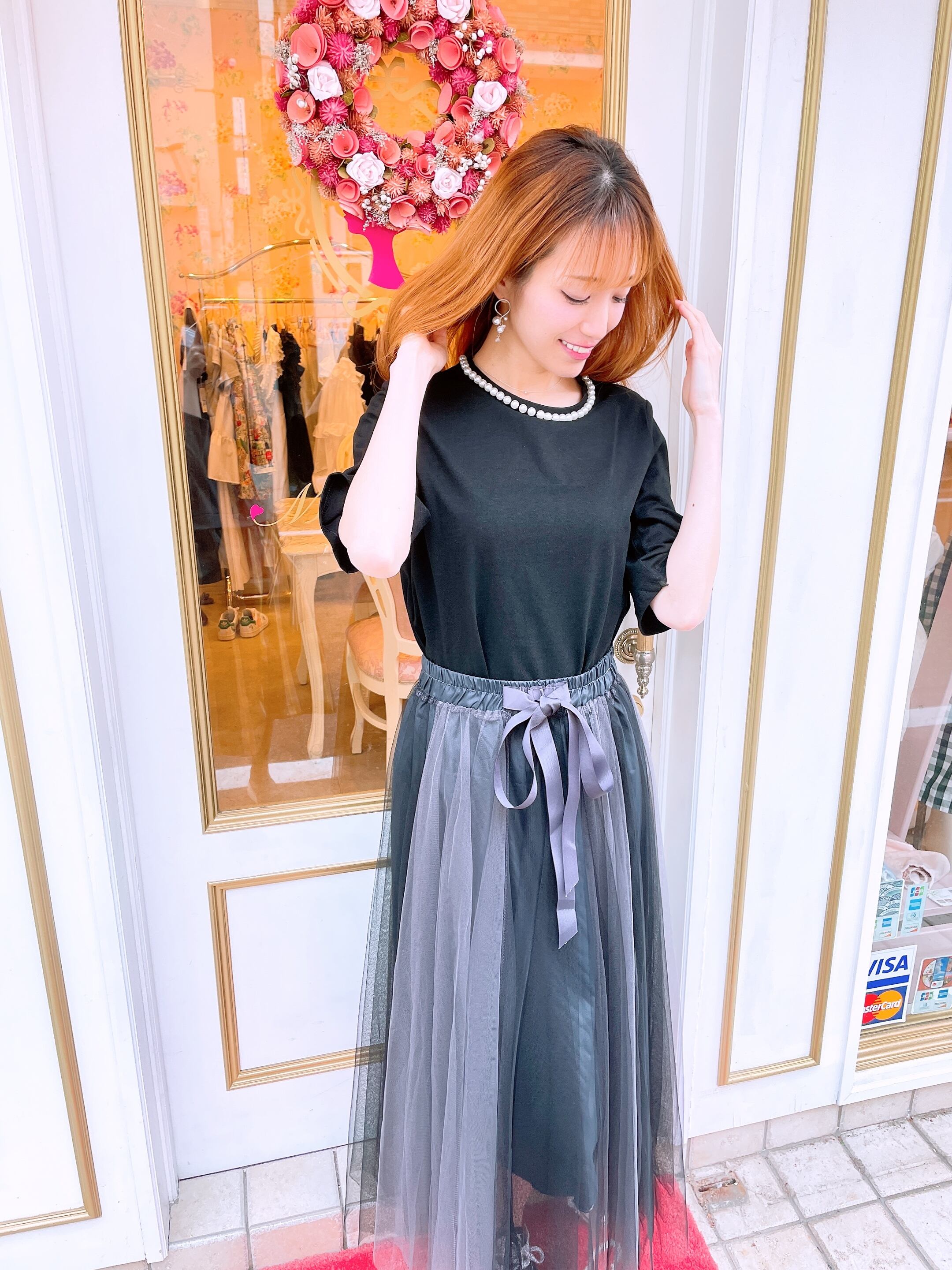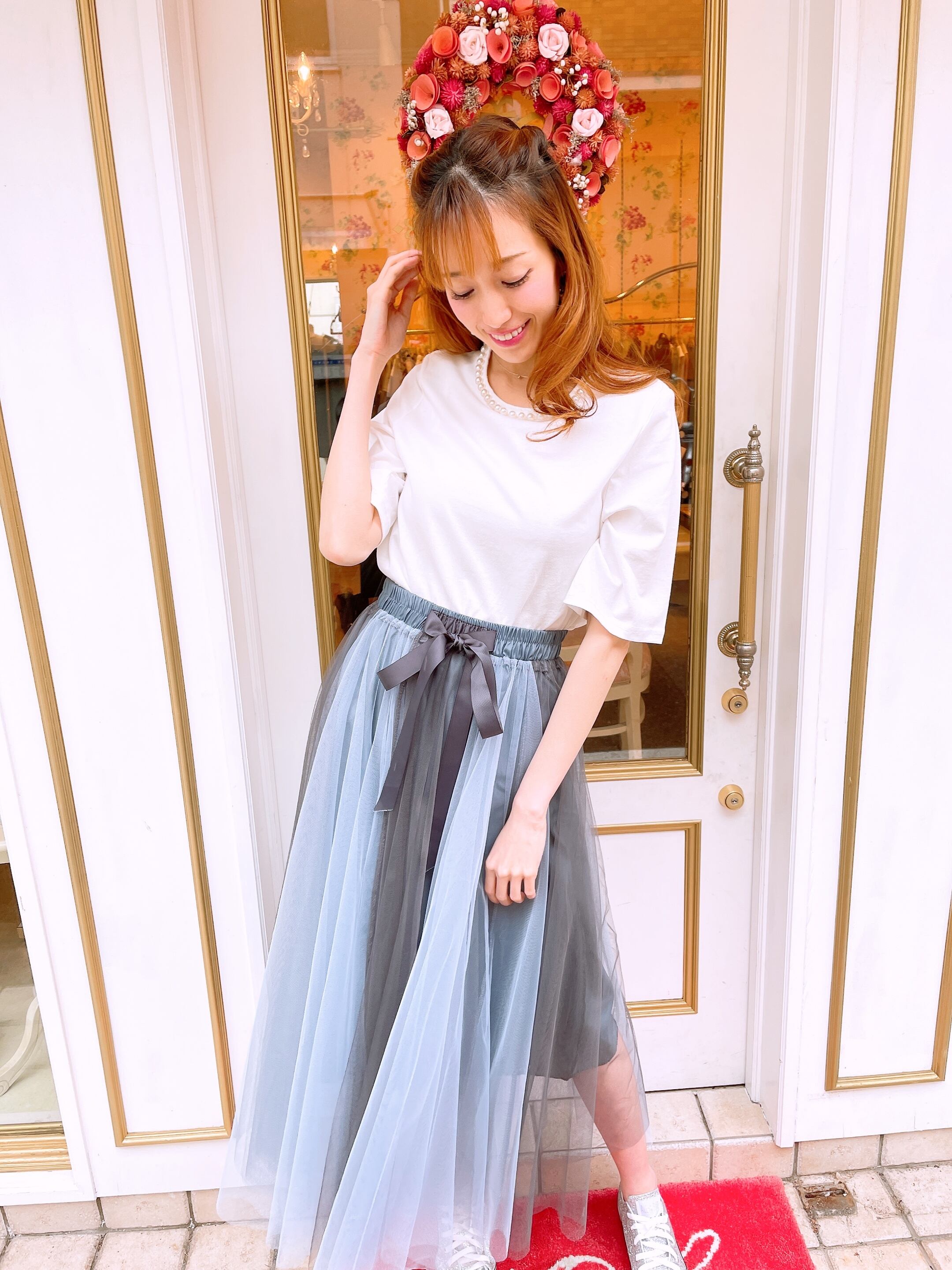 配色デザインにウエストリボンがアクセントのチュールスカート。