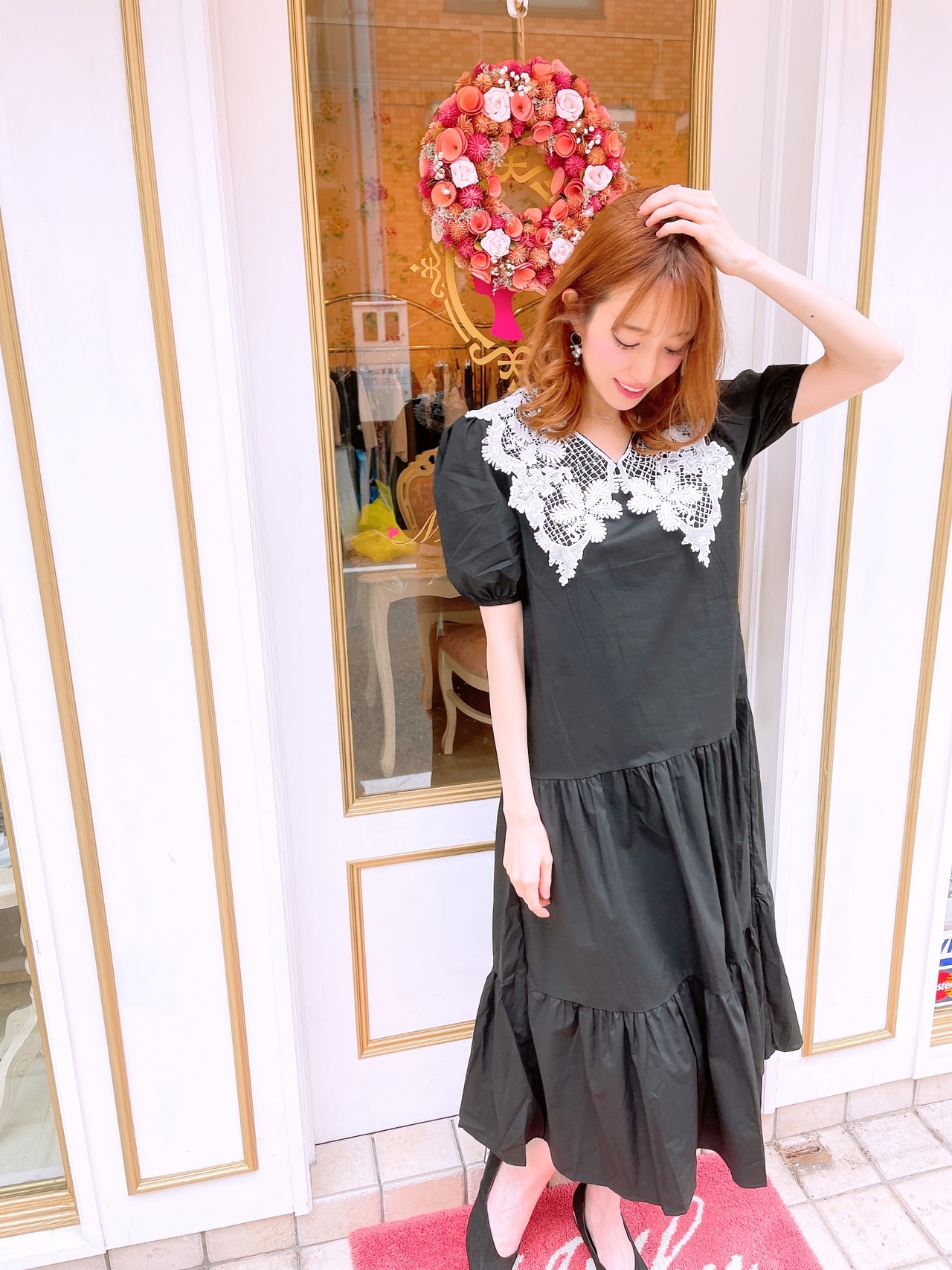 大きめなレースの襟元に、パフスリーブが大人可愛いワンピース。