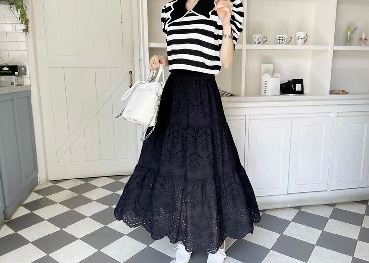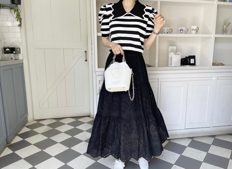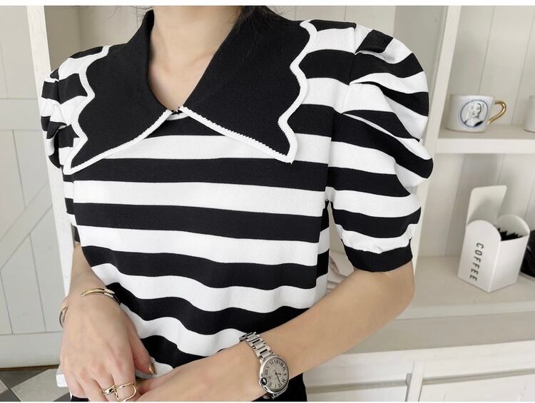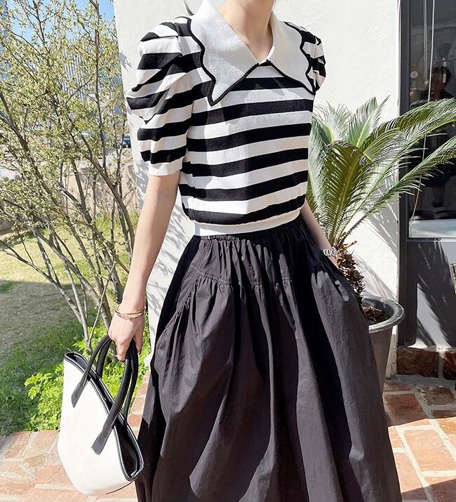 配色の襟元にパフスリーブ、ボーダーデザインのトップス。