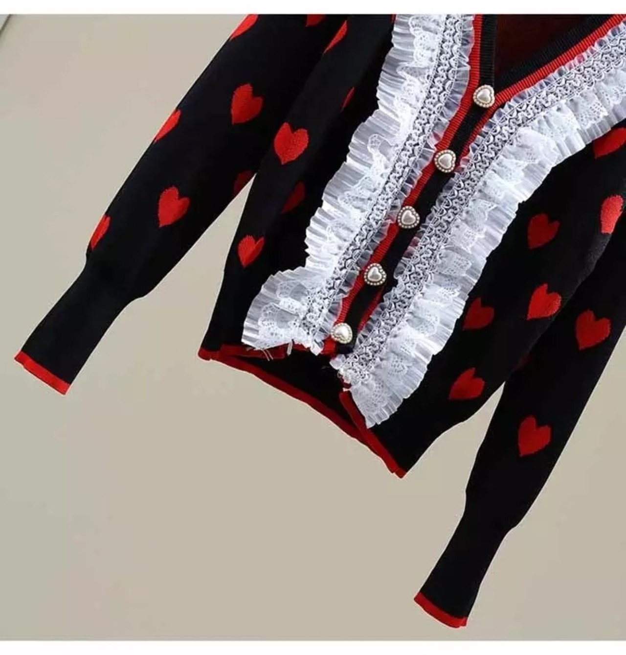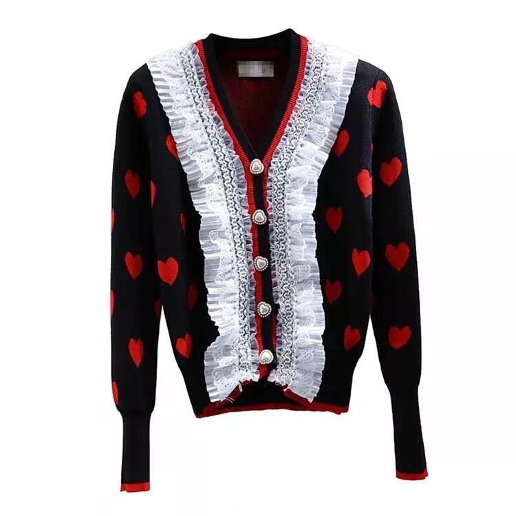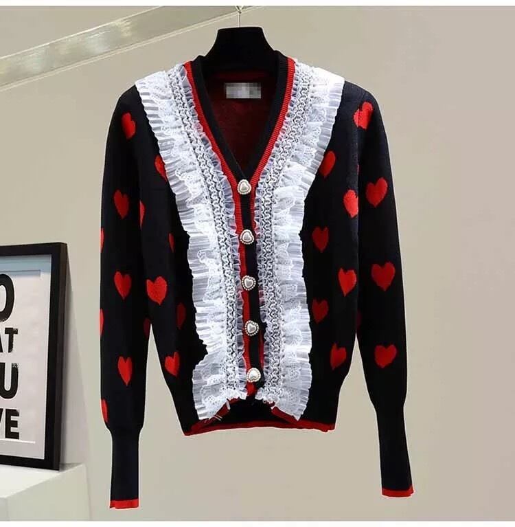 ハートドットデザインにレースやボタンが華やかなニットカーディガン。