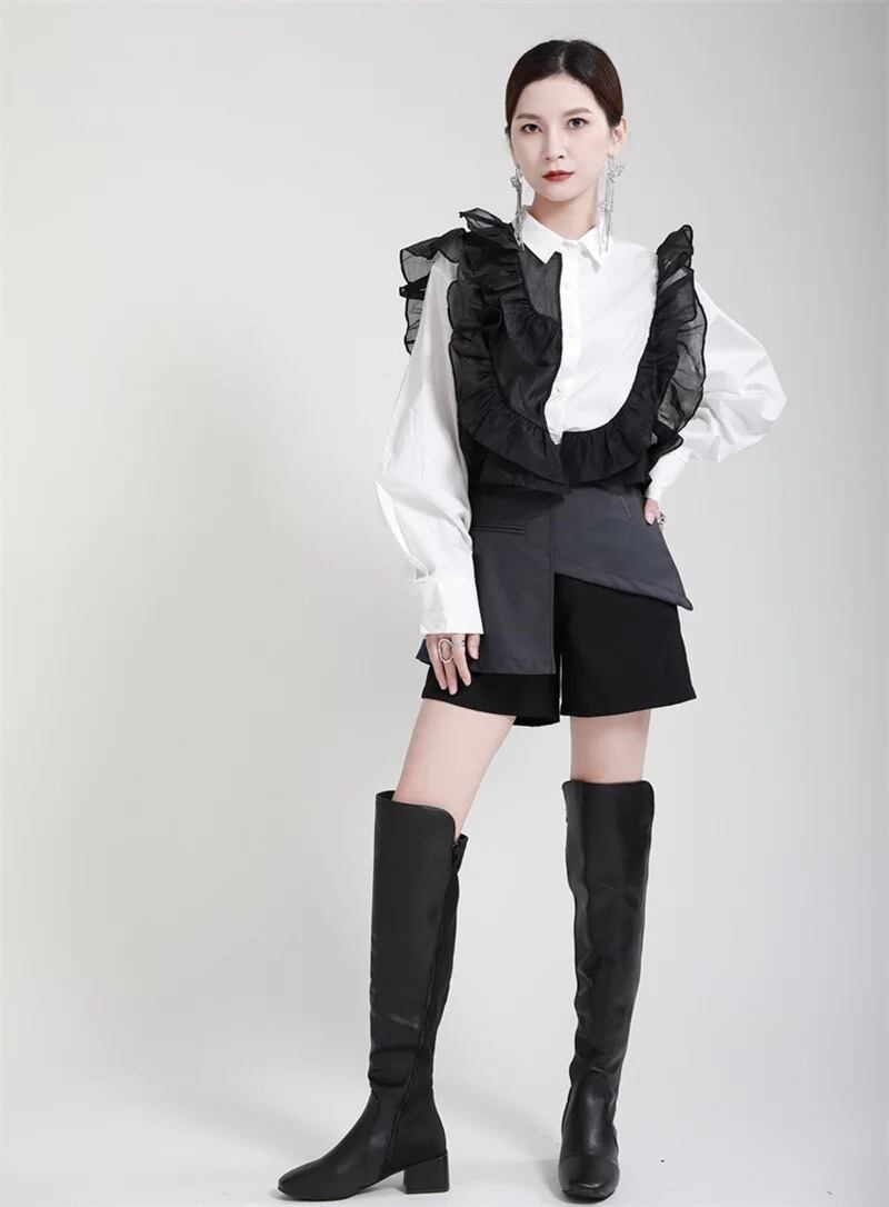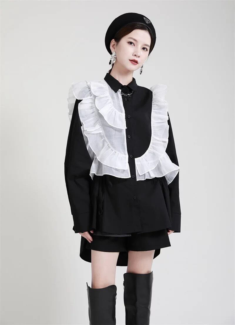 アシンメトリーにデザインされたフリルと配色が華やかなブラウス。