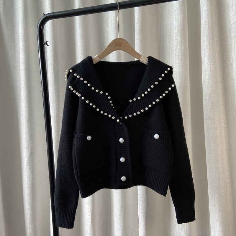 セーラーカラーにパールが華やかなデザインのニットカーディガン。