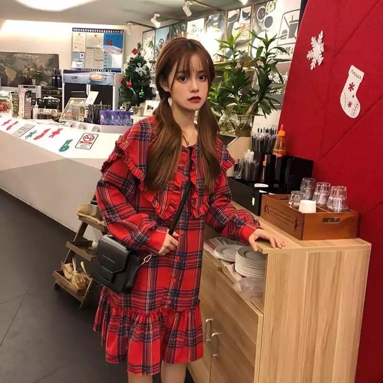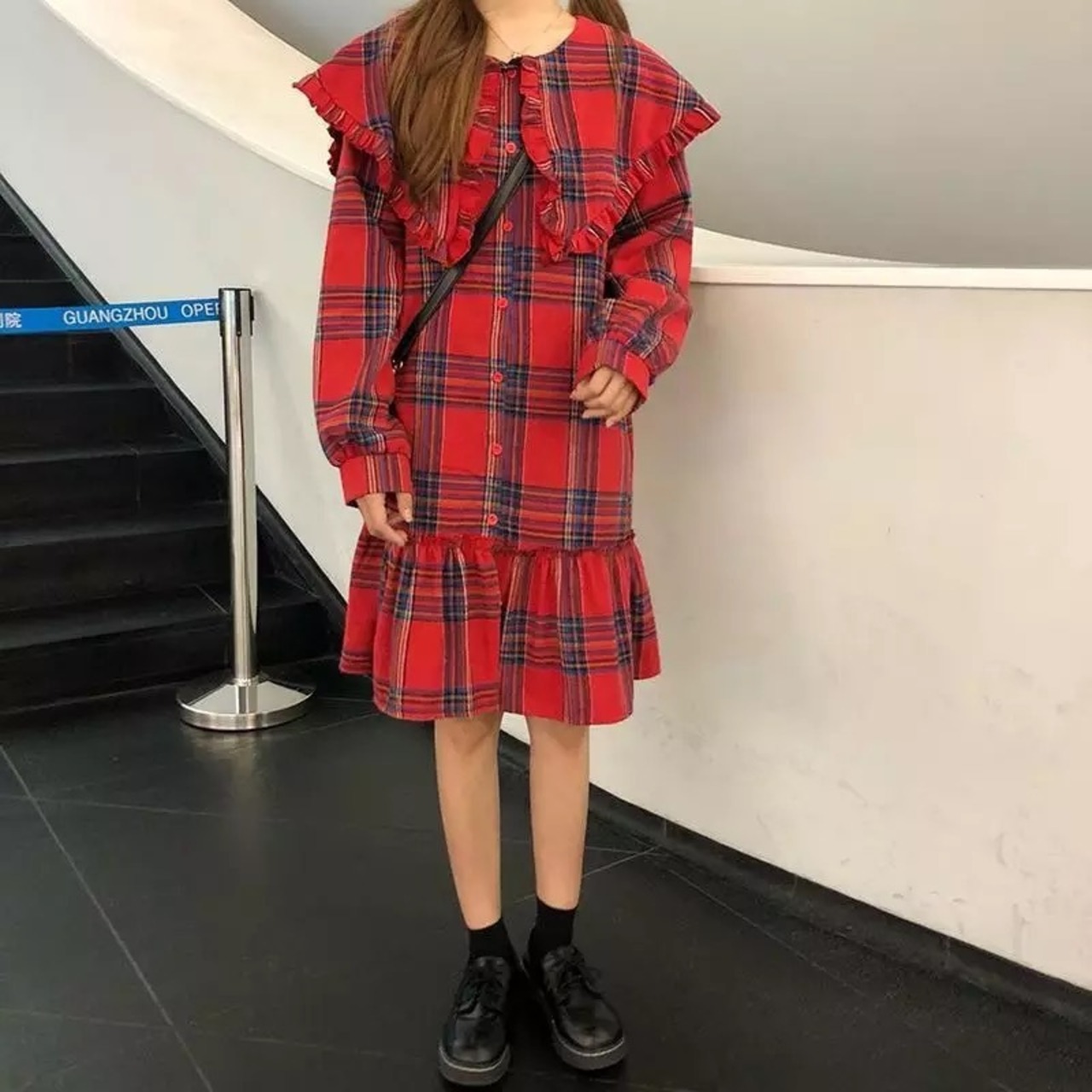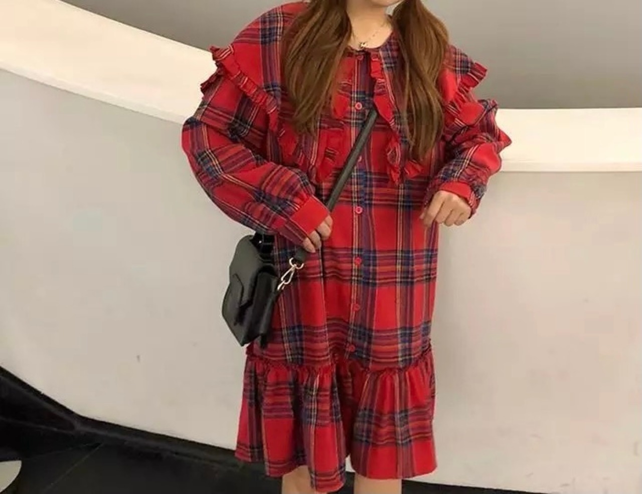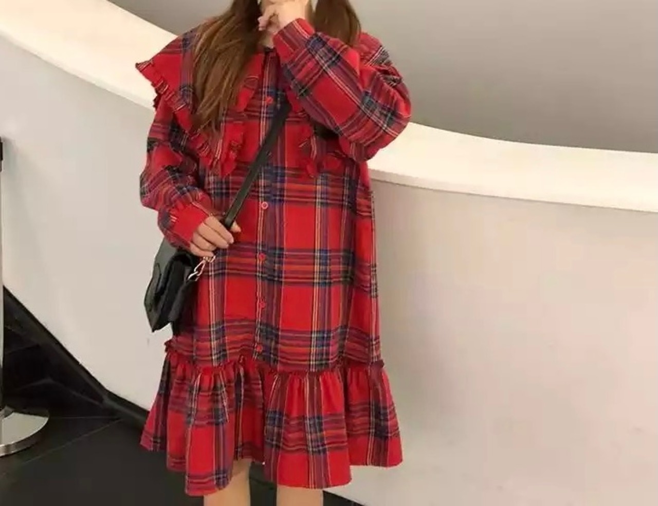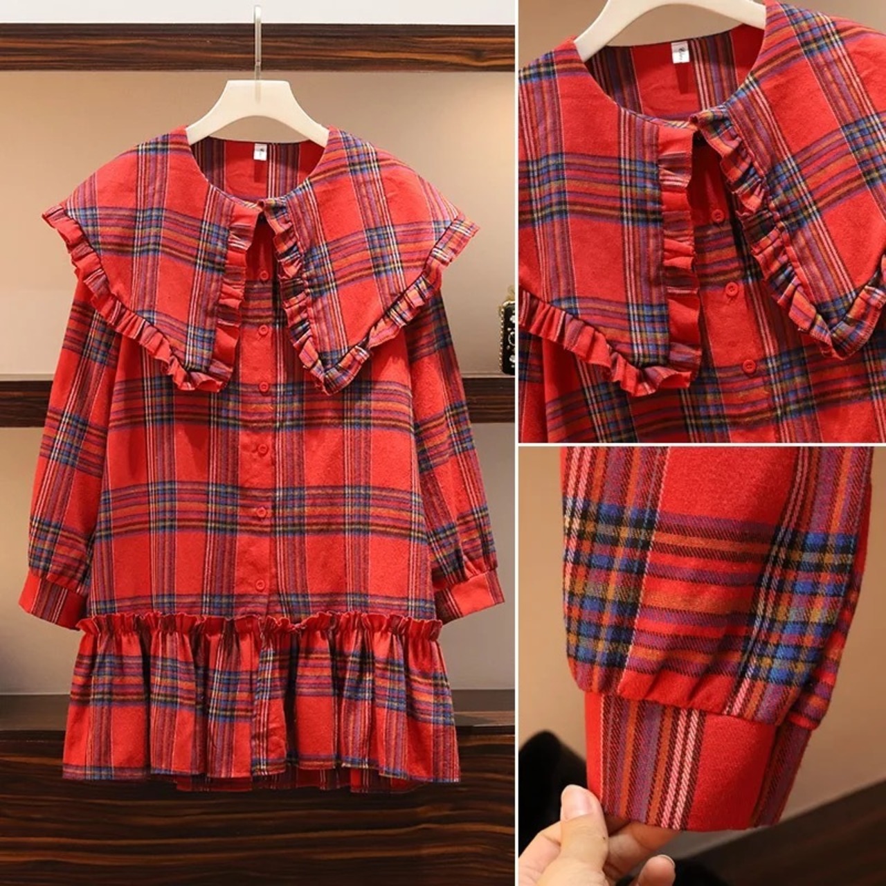 チェック柄のセーラーカラーワンピース。