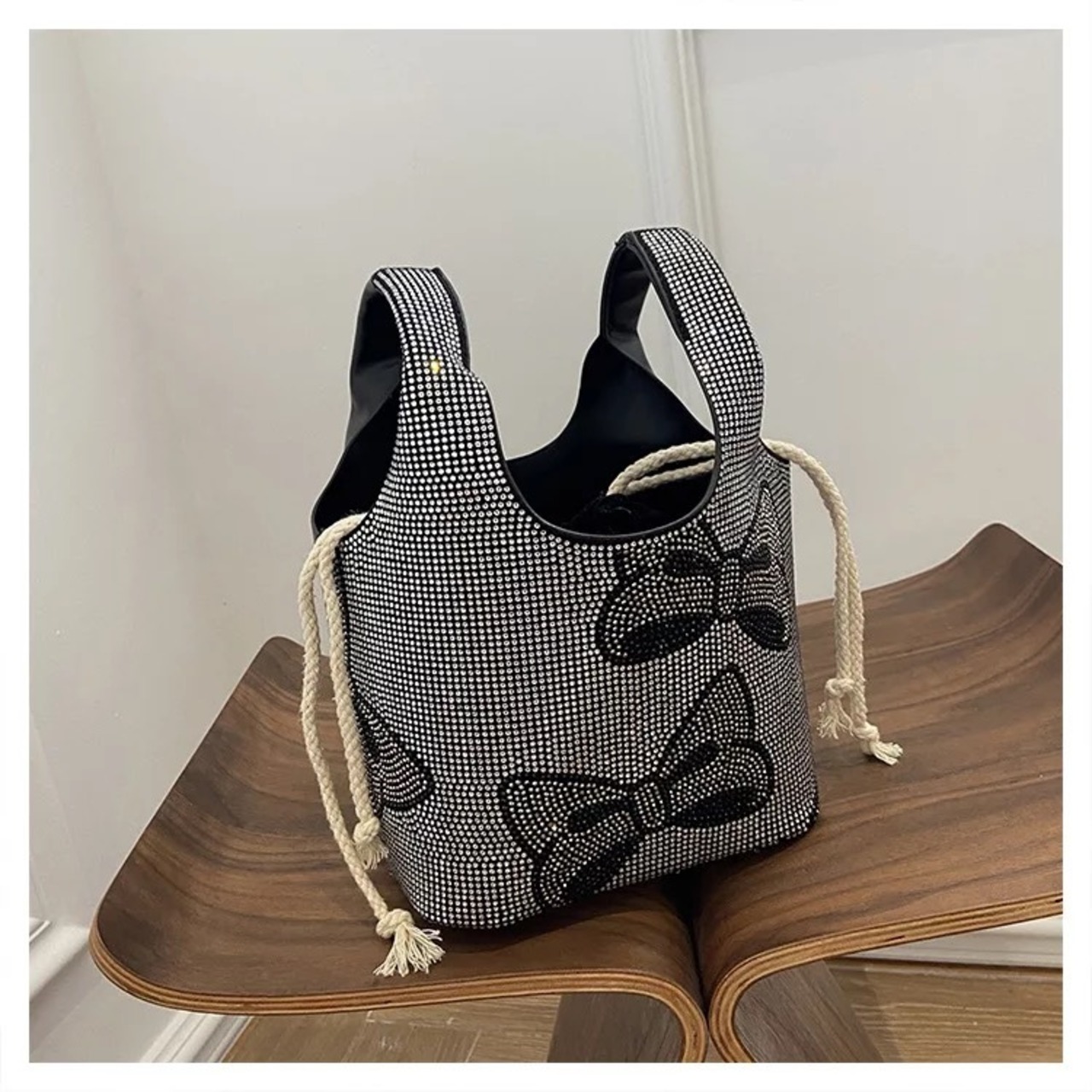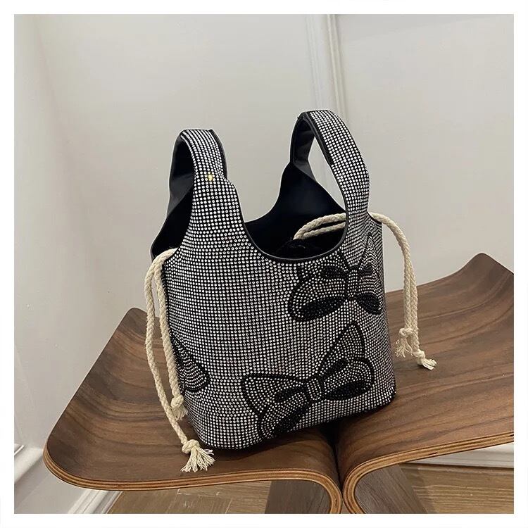 キラキラなストーンが華やかなバッグには、リボンがデザインされています。