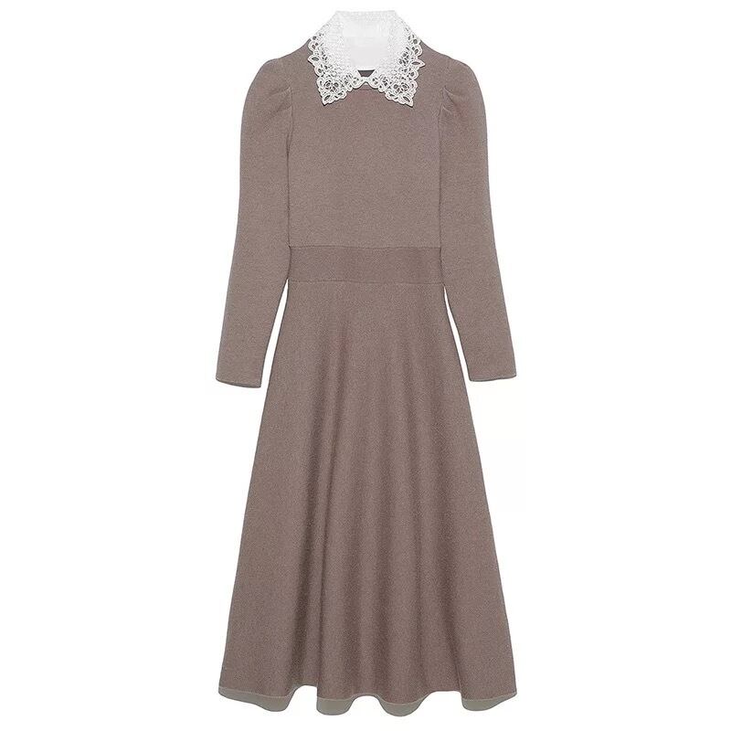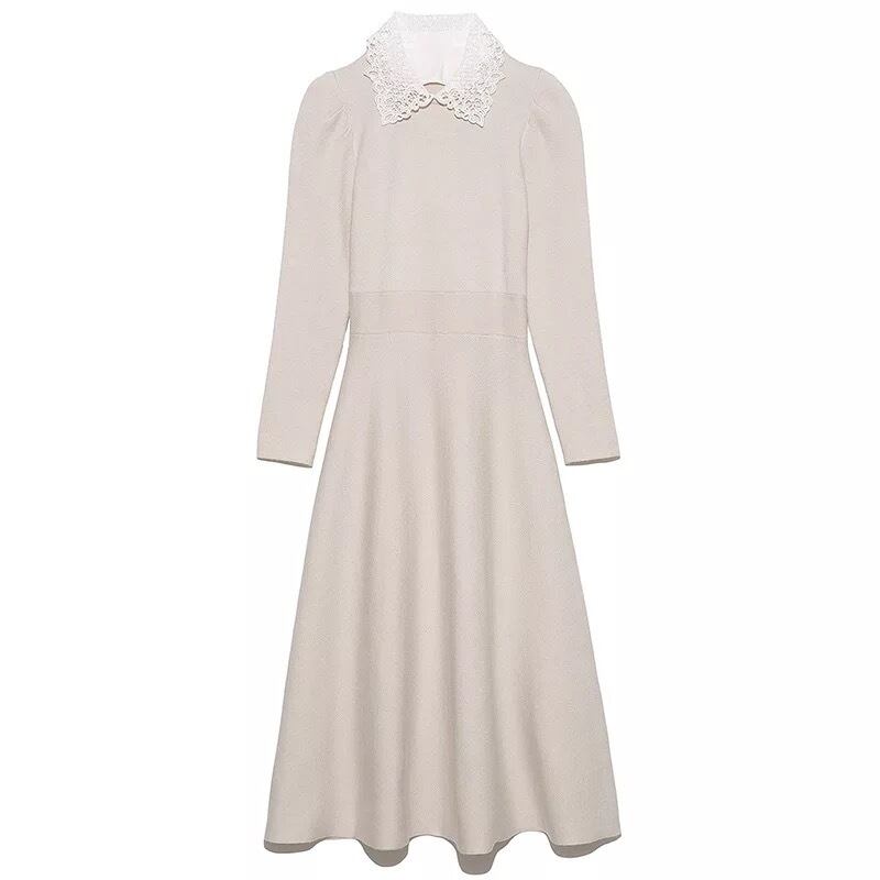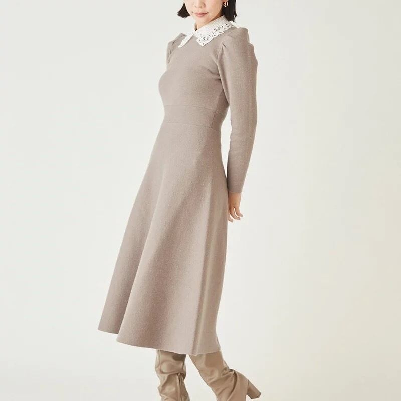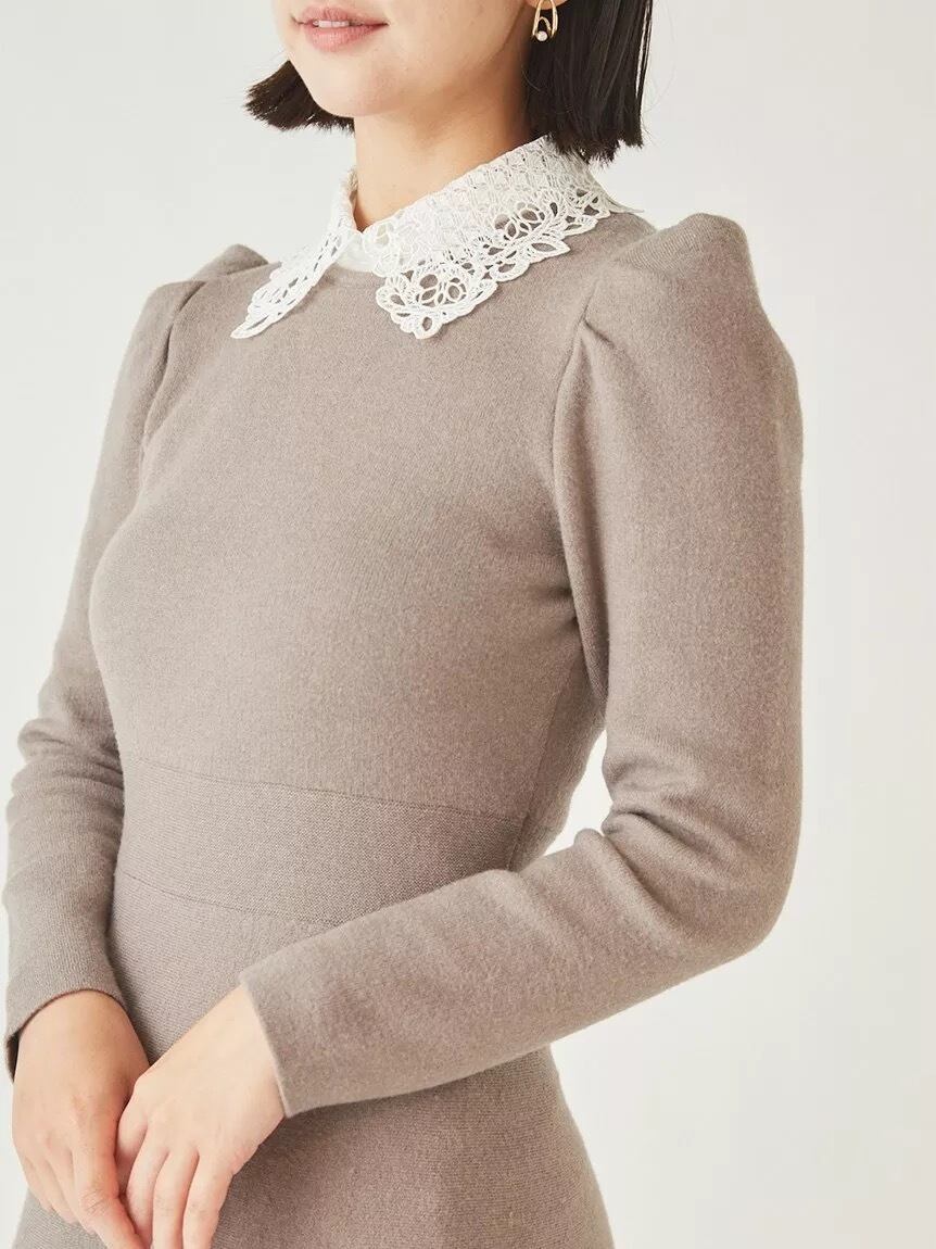お取り外し可能のレース襟がデザインされたニットワンピース。