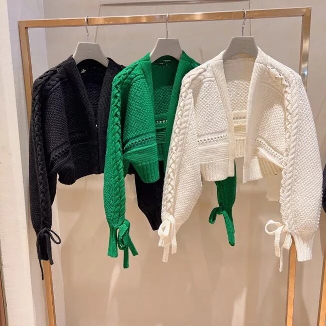 クロスアップリボンがお袖にデザインされたニットカーディガン。
