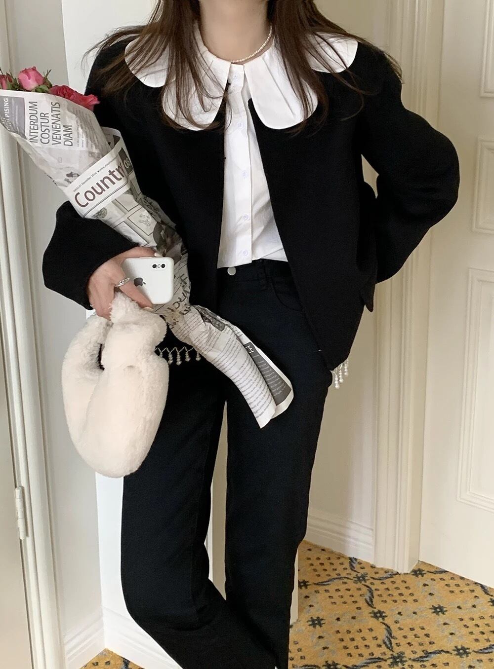 カーディガンやニット合わせにも襟元が映えるブラウスです。
