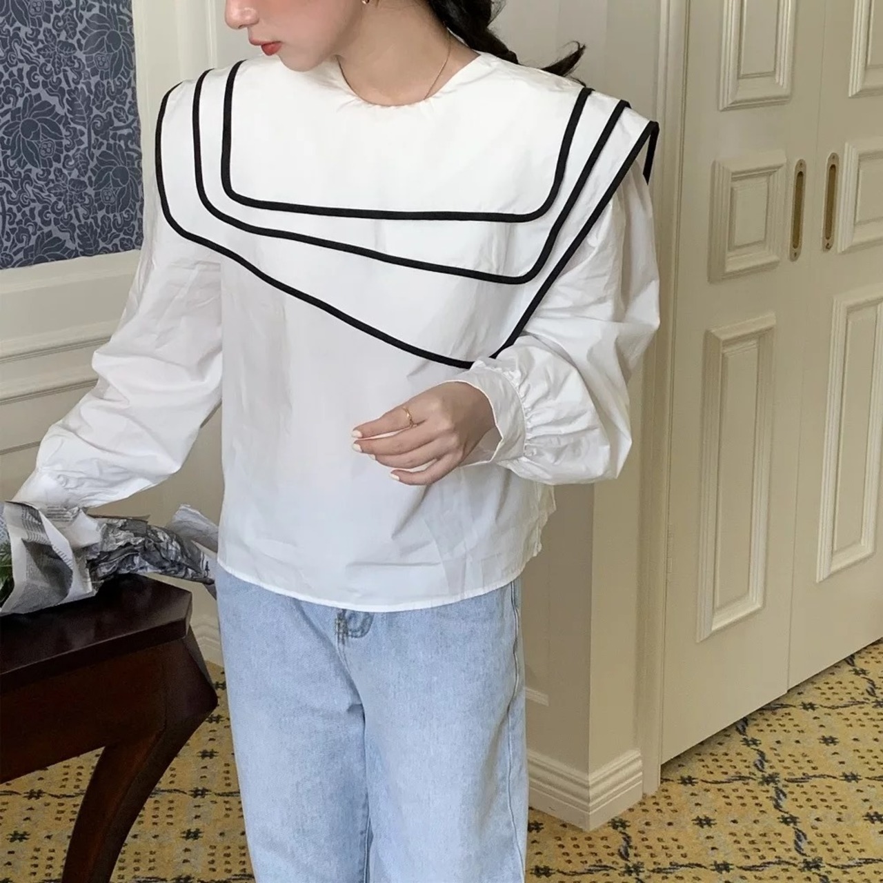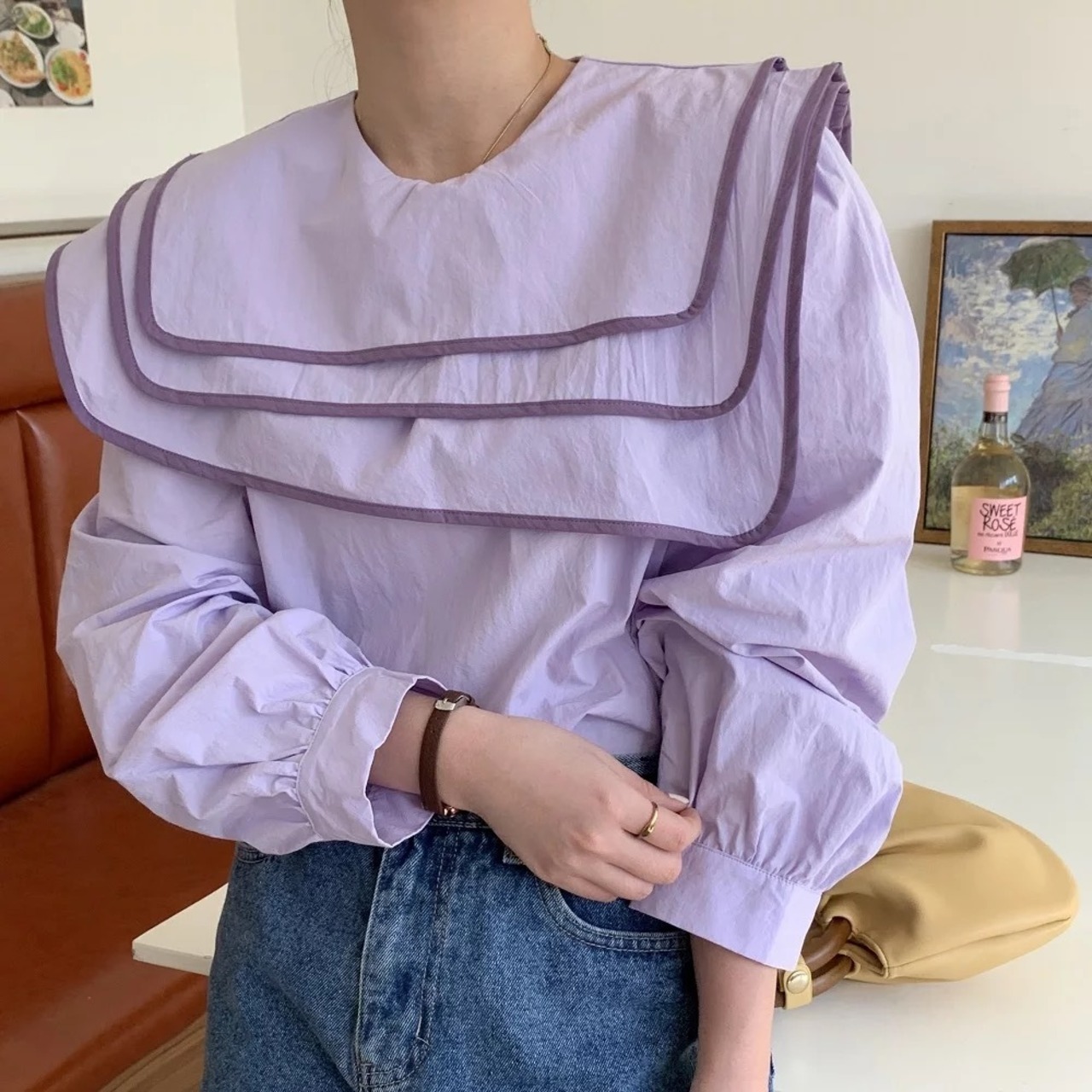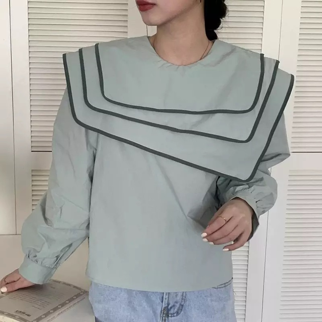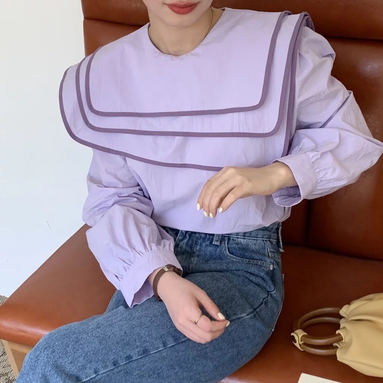 配色セーラーカラーのブラウスは、アシンメトリーやレイヤードデザインがオシャレに。