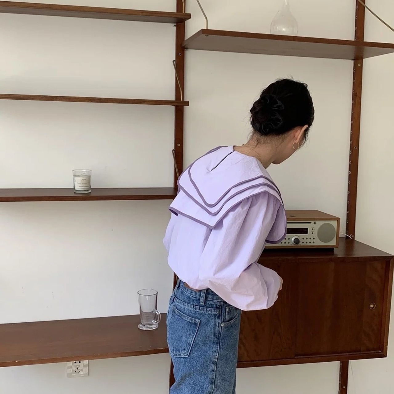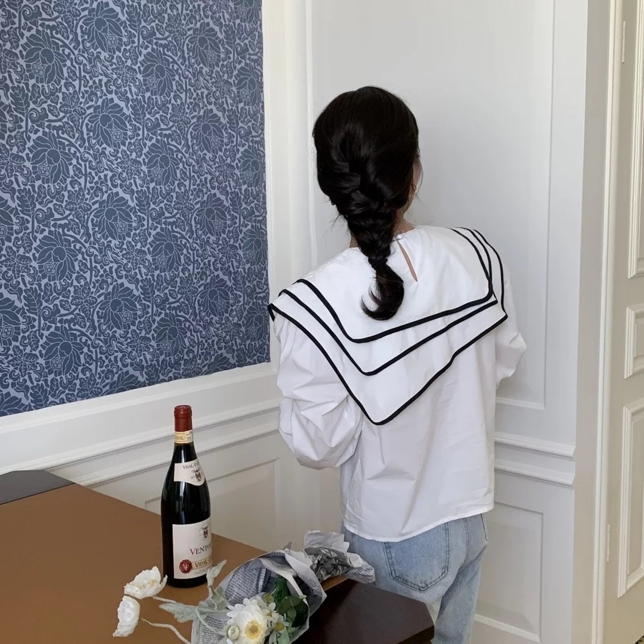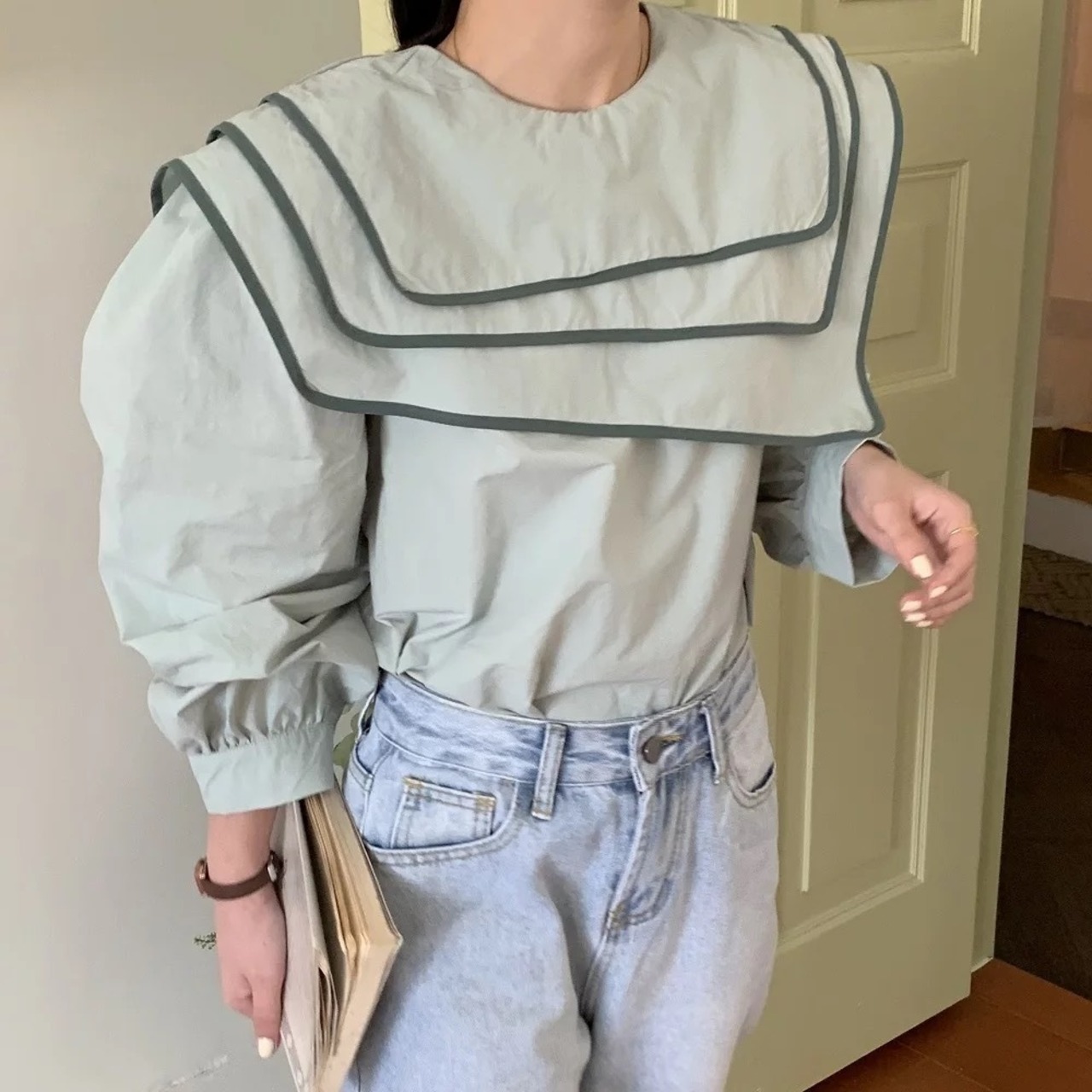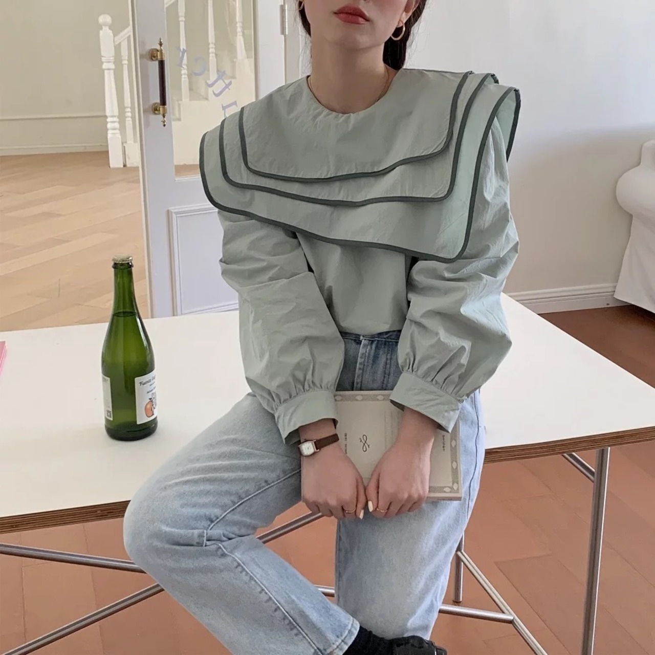 配色セーラーカラーのブラウスは、アシンメトリーやレイヤードデザインがオシャレに。