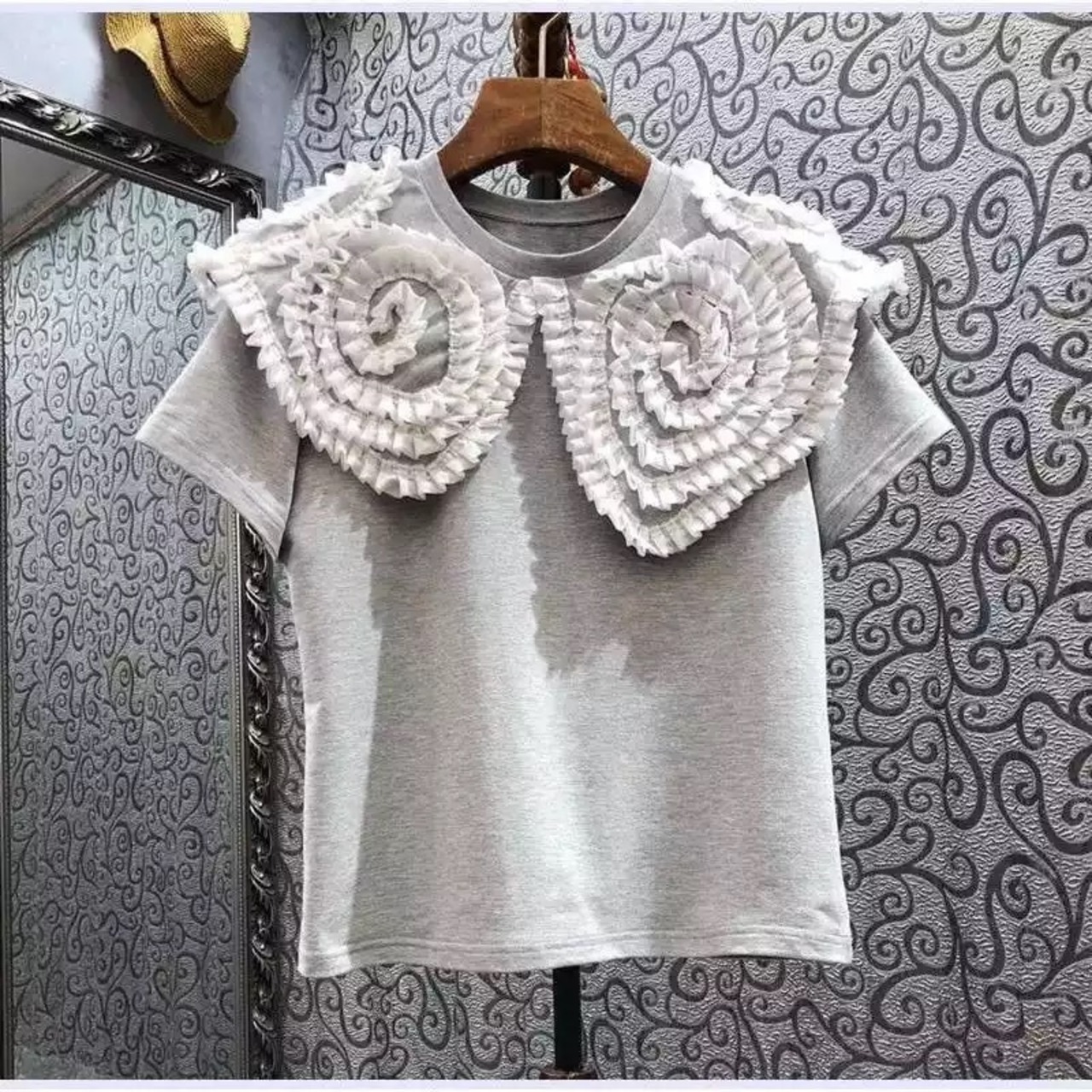 フリルビッグカラーが華やかなTシャツ。