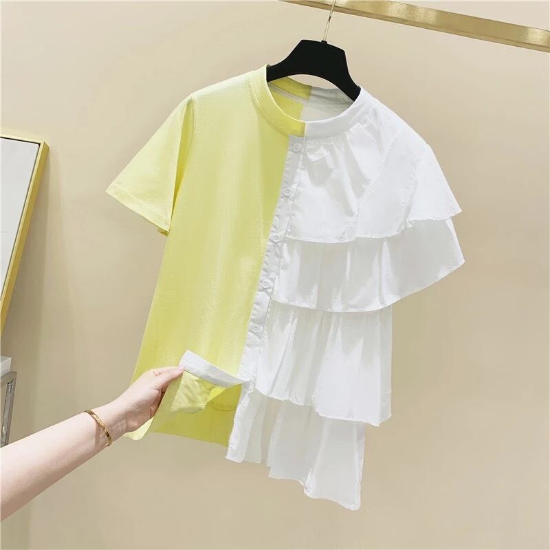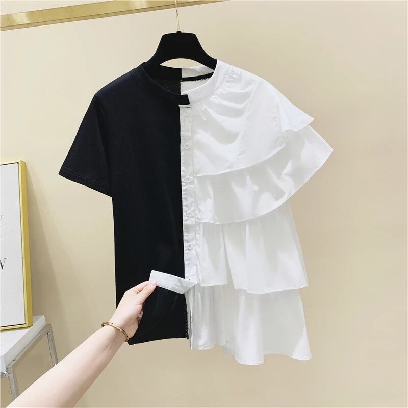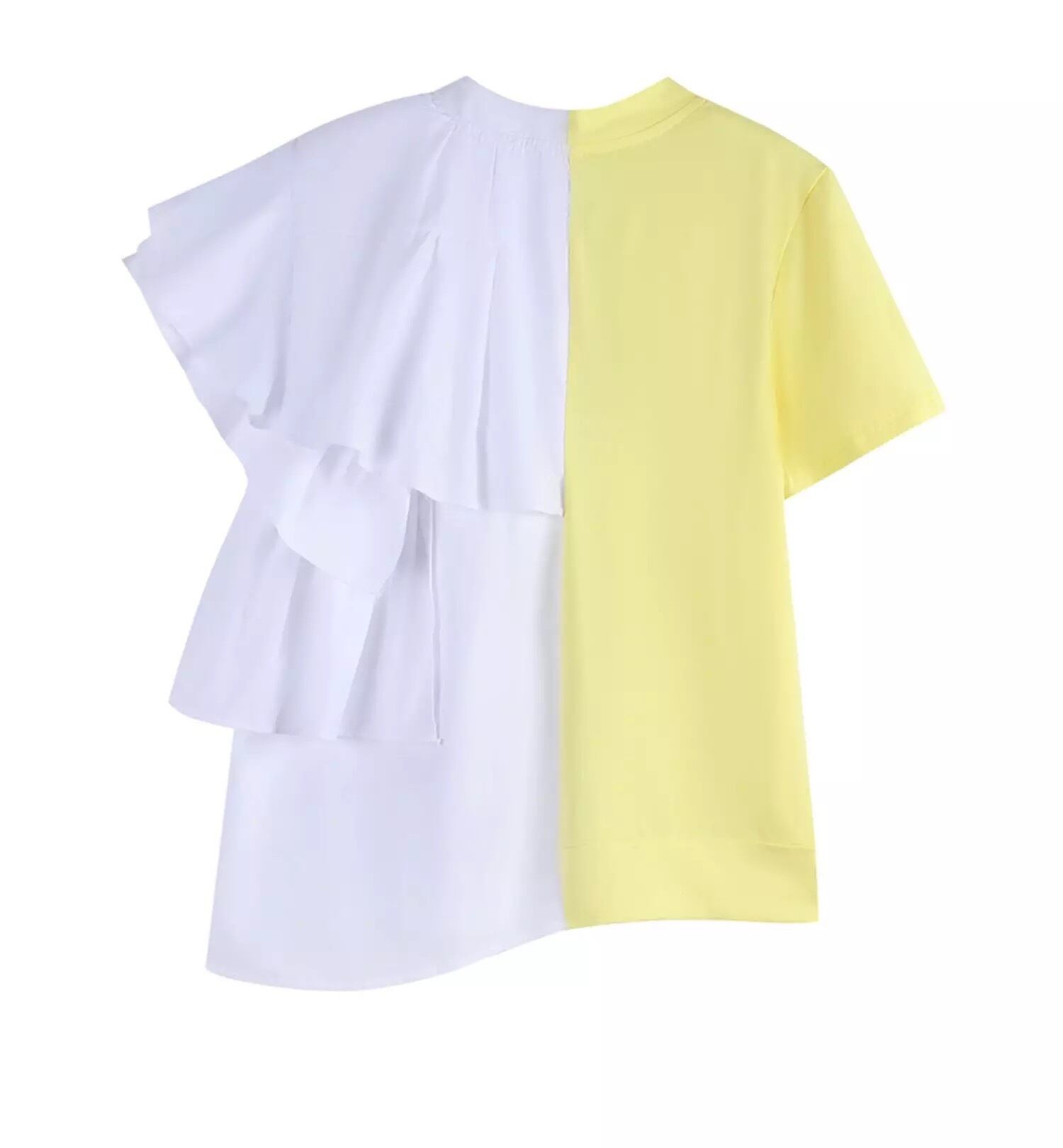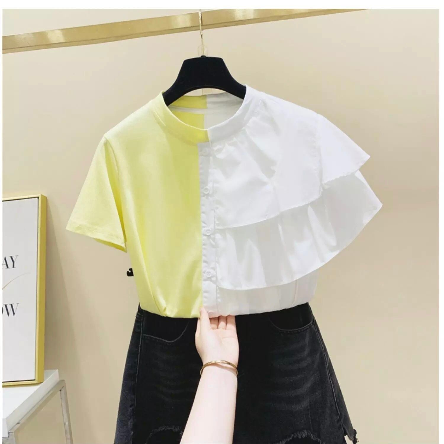 配色フリルデザインのTシャツ。