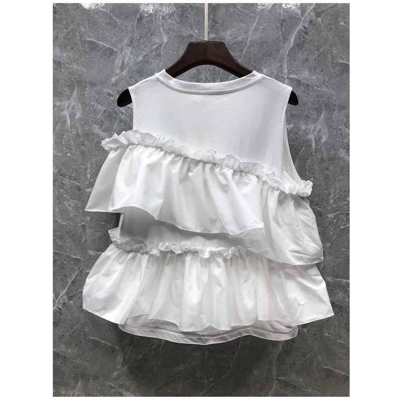 フリルが華やかなトップスは、片方の肩がオープンショルダーになりアクセントに。