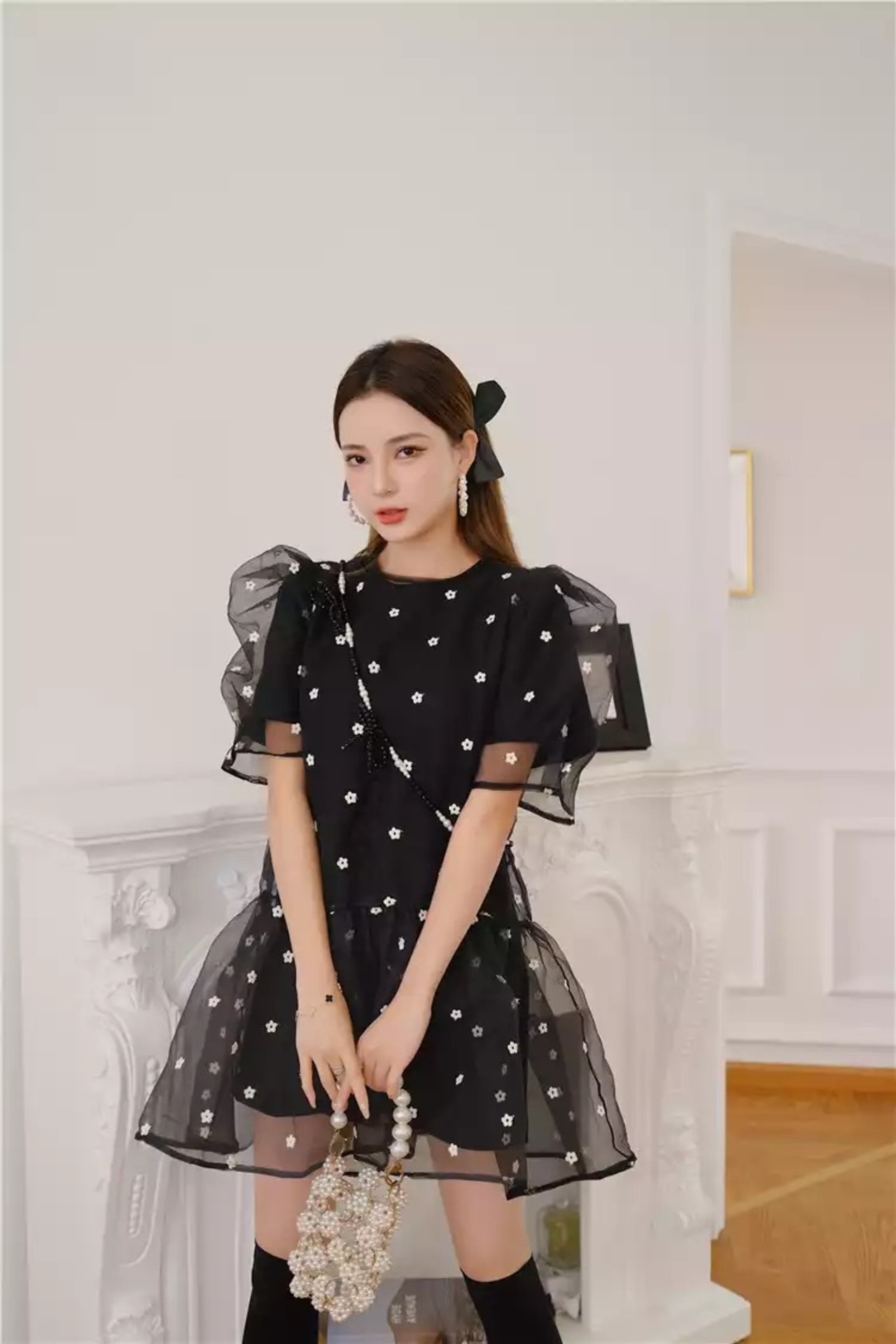 フラワー刺繍とチュールが可愛いワンピースは、デニムやショーパン合わせでブラウスとしても素敵なスタイリングに。