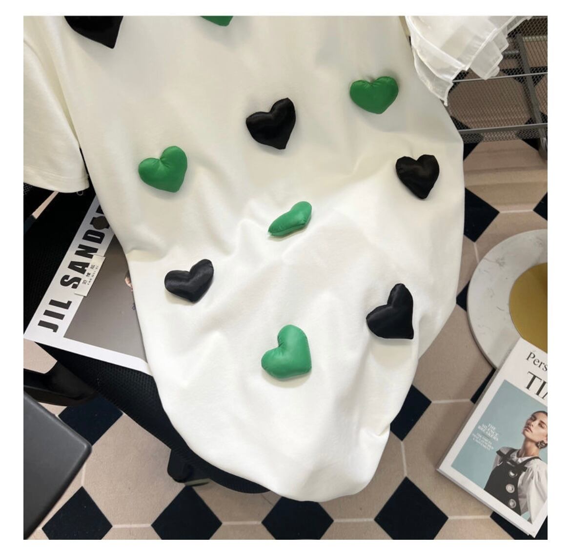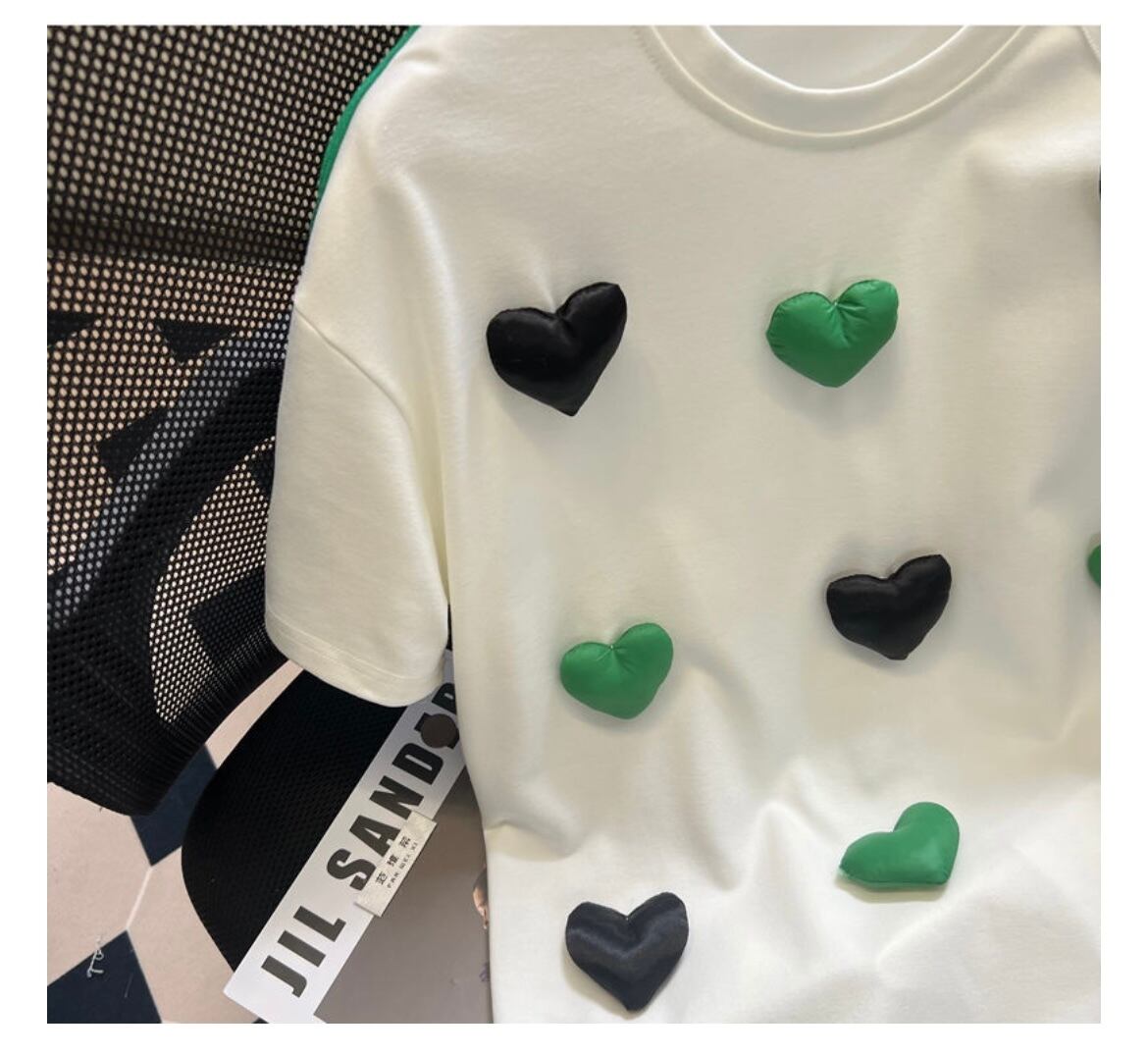 立体感あるハートやフリルがデザインされたTシャツ。