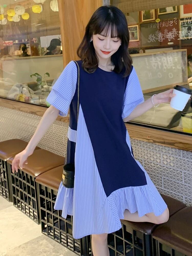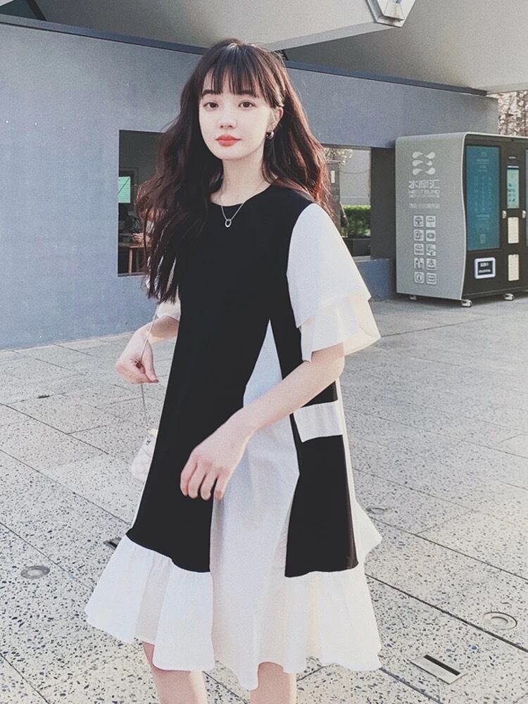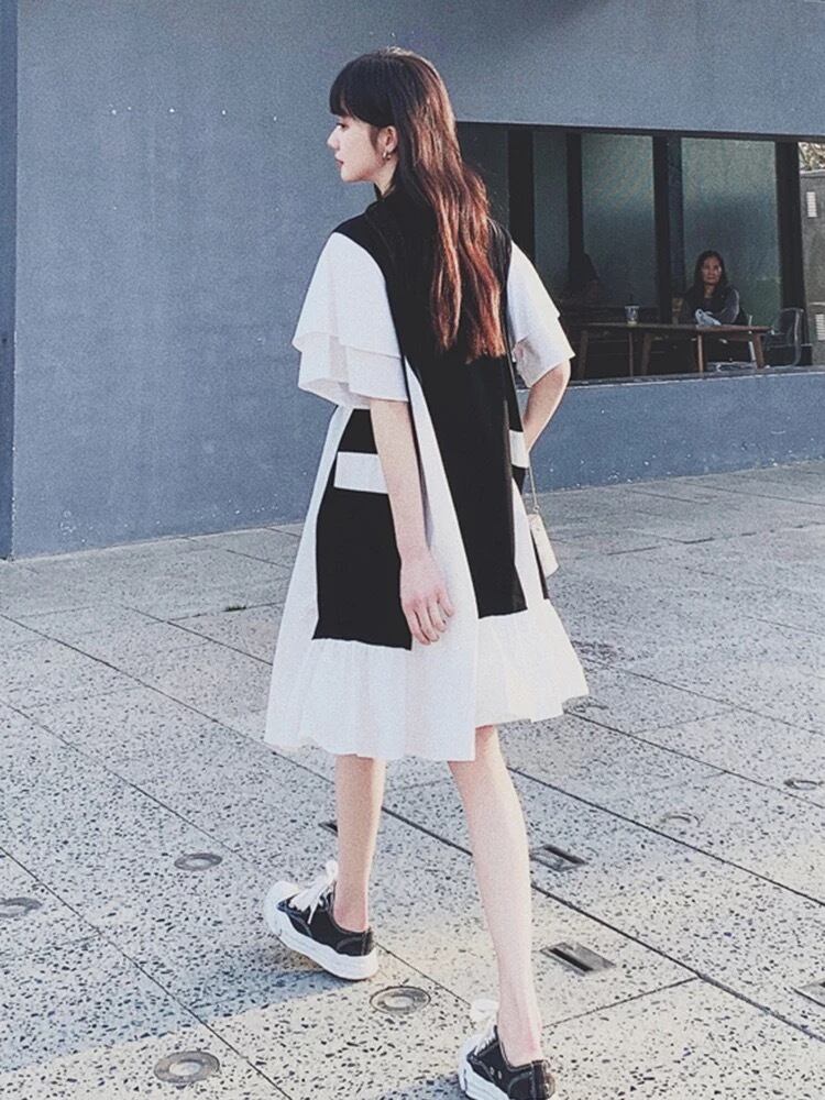 配色デザインにフリルスリーブのワンピース。