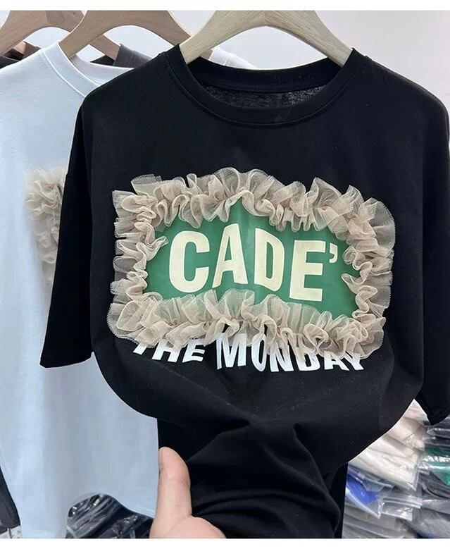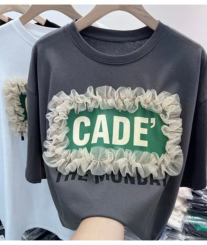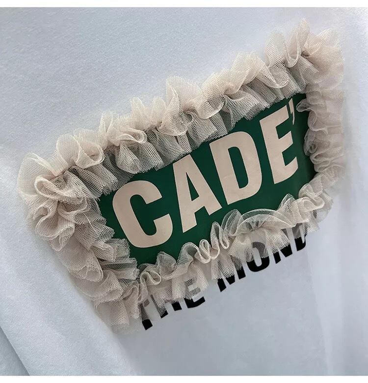 ロゴプリントのカジュアルさにチュールの甘さがミックスされたTシャツ。
