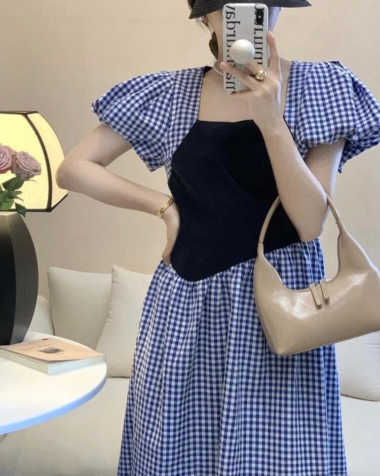 ギンガムチェックと配色デザインのワンピース。