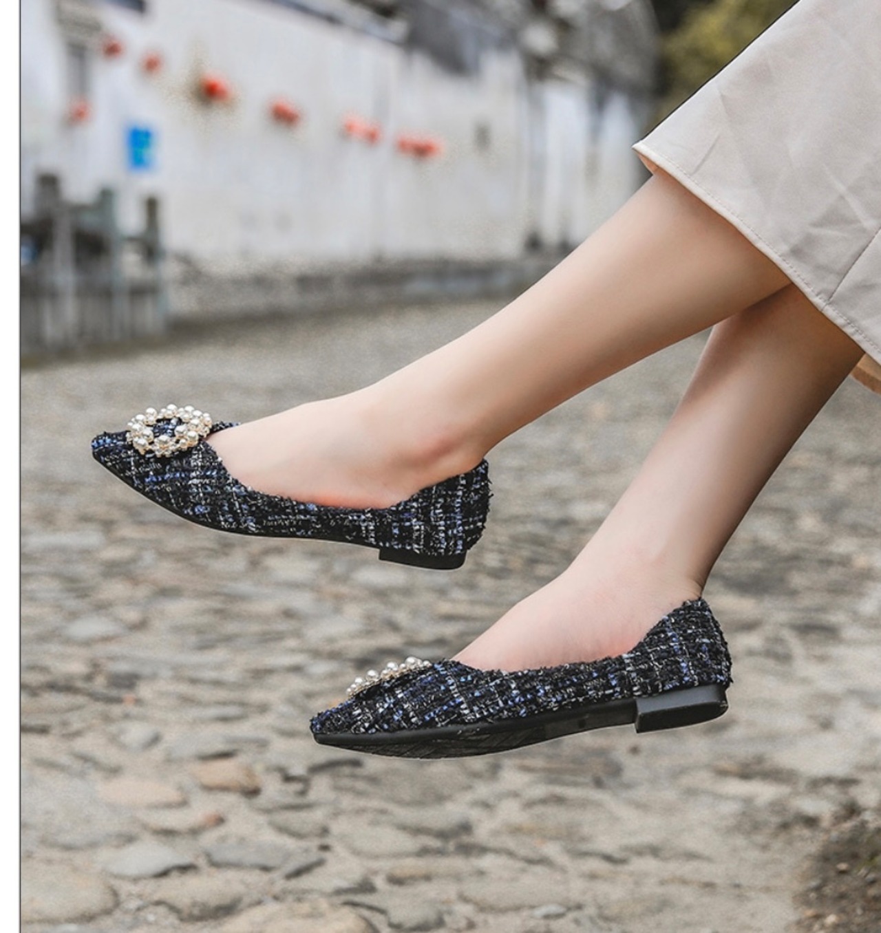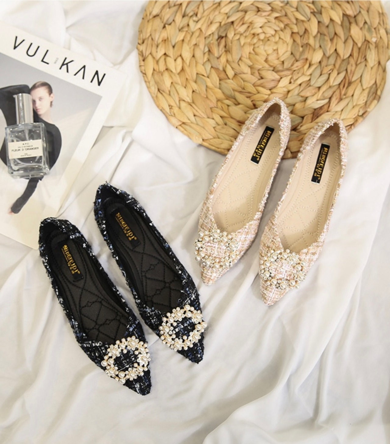 ツイードにパールビジューが華やかなフラットビジューパンプス