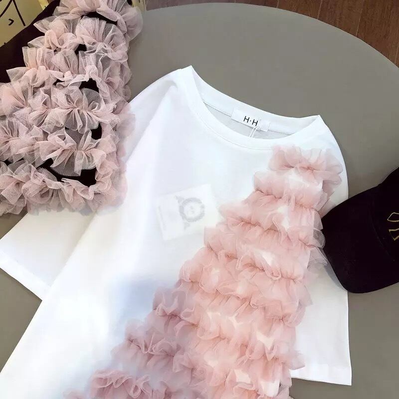 アシンメトリーにデザインされたチュールが華やかなTシャツ。