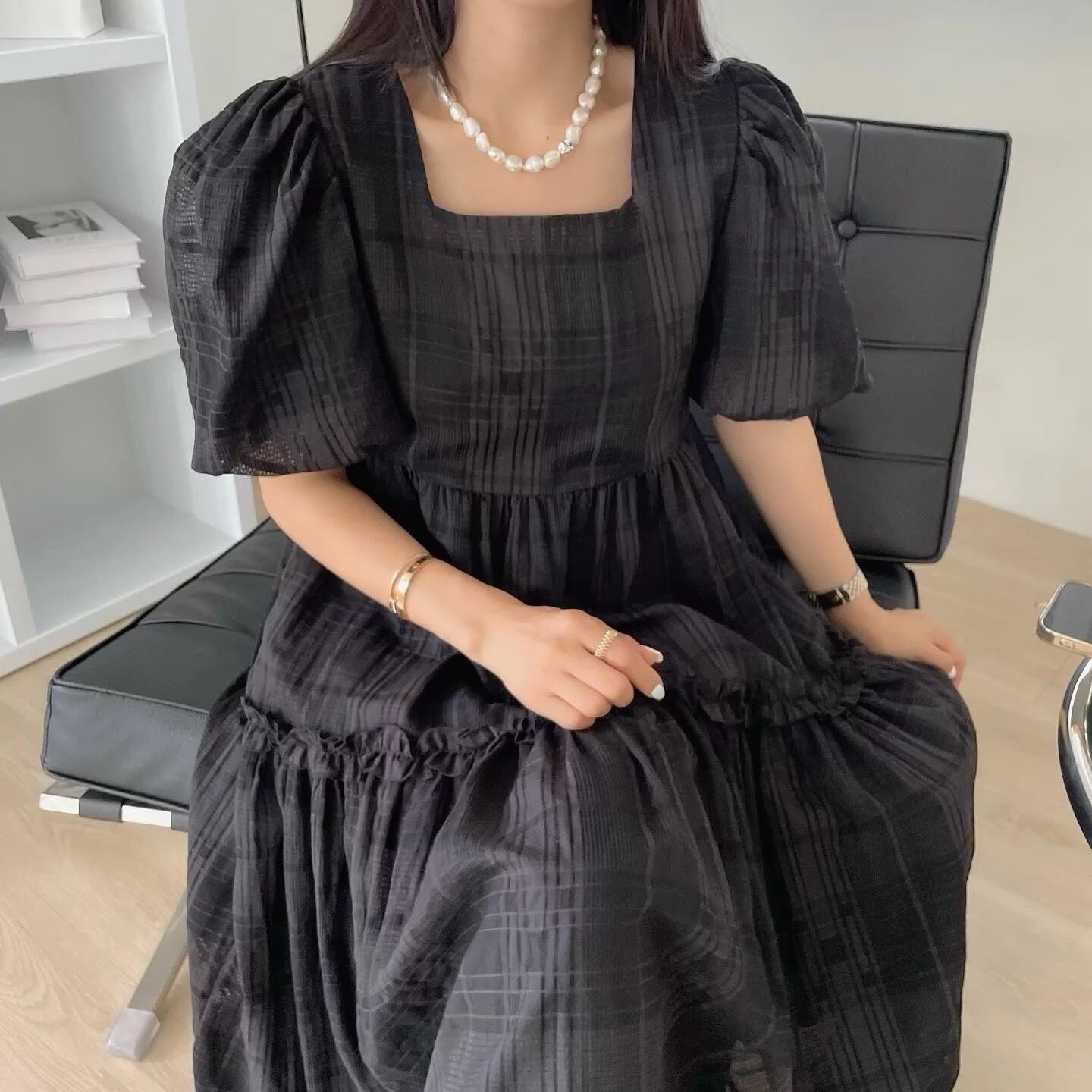 バックリボンがアクセントになりパフショルダースリーブも大人可愛いデザインのワンピースです。