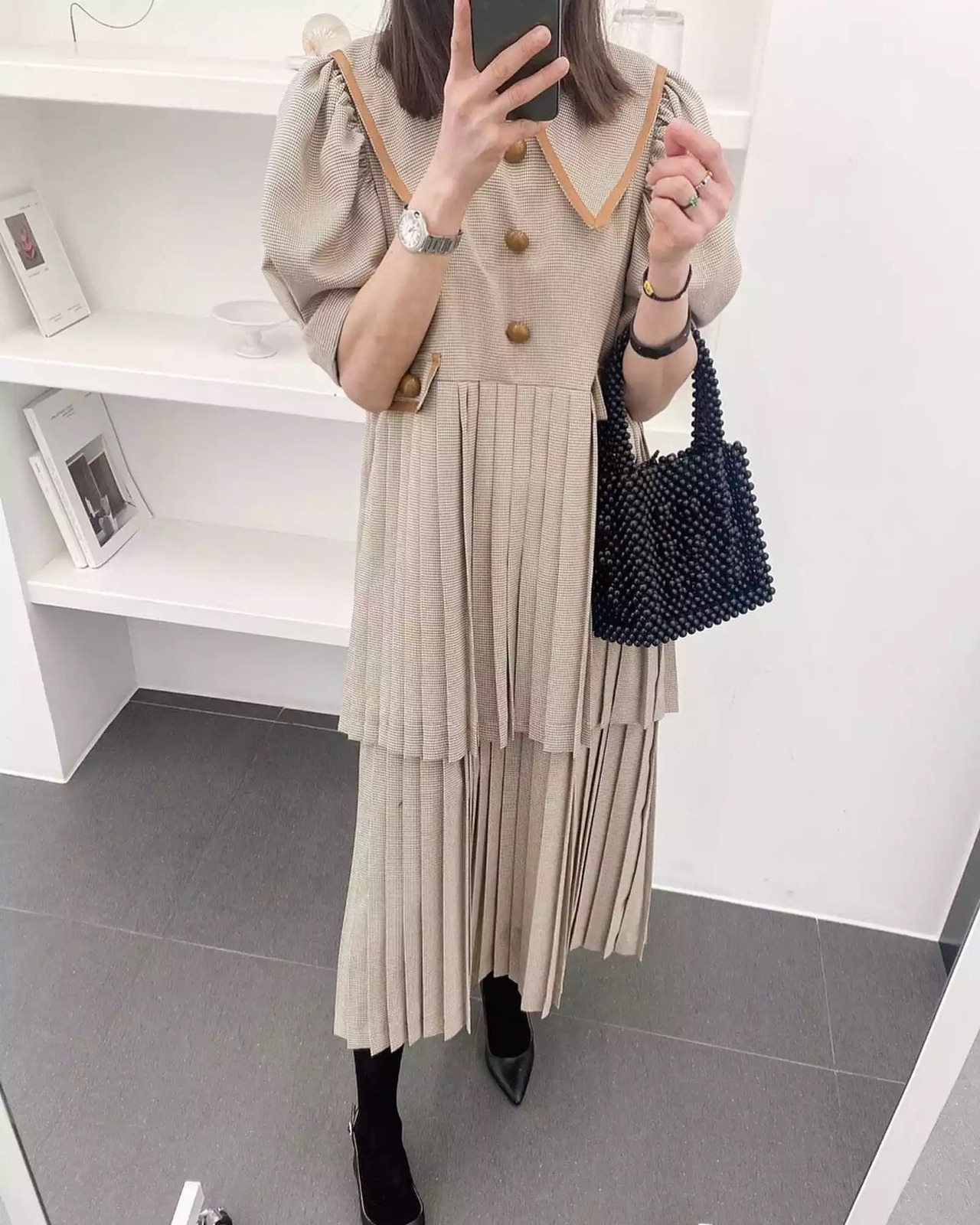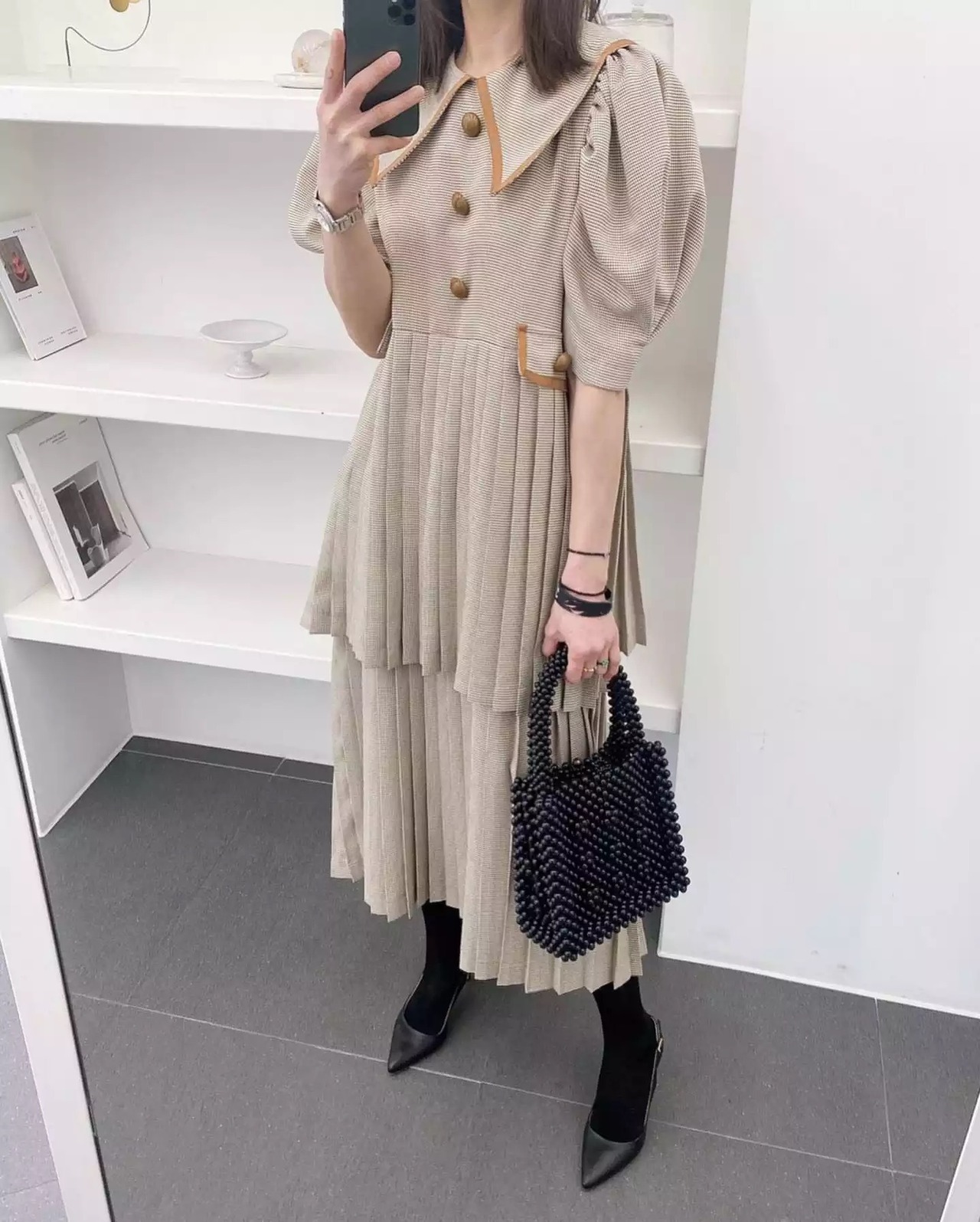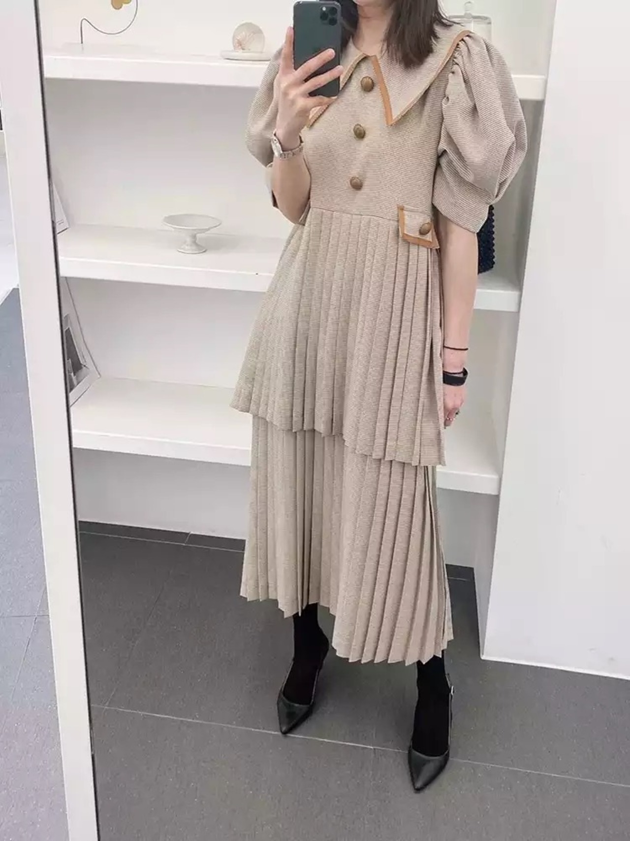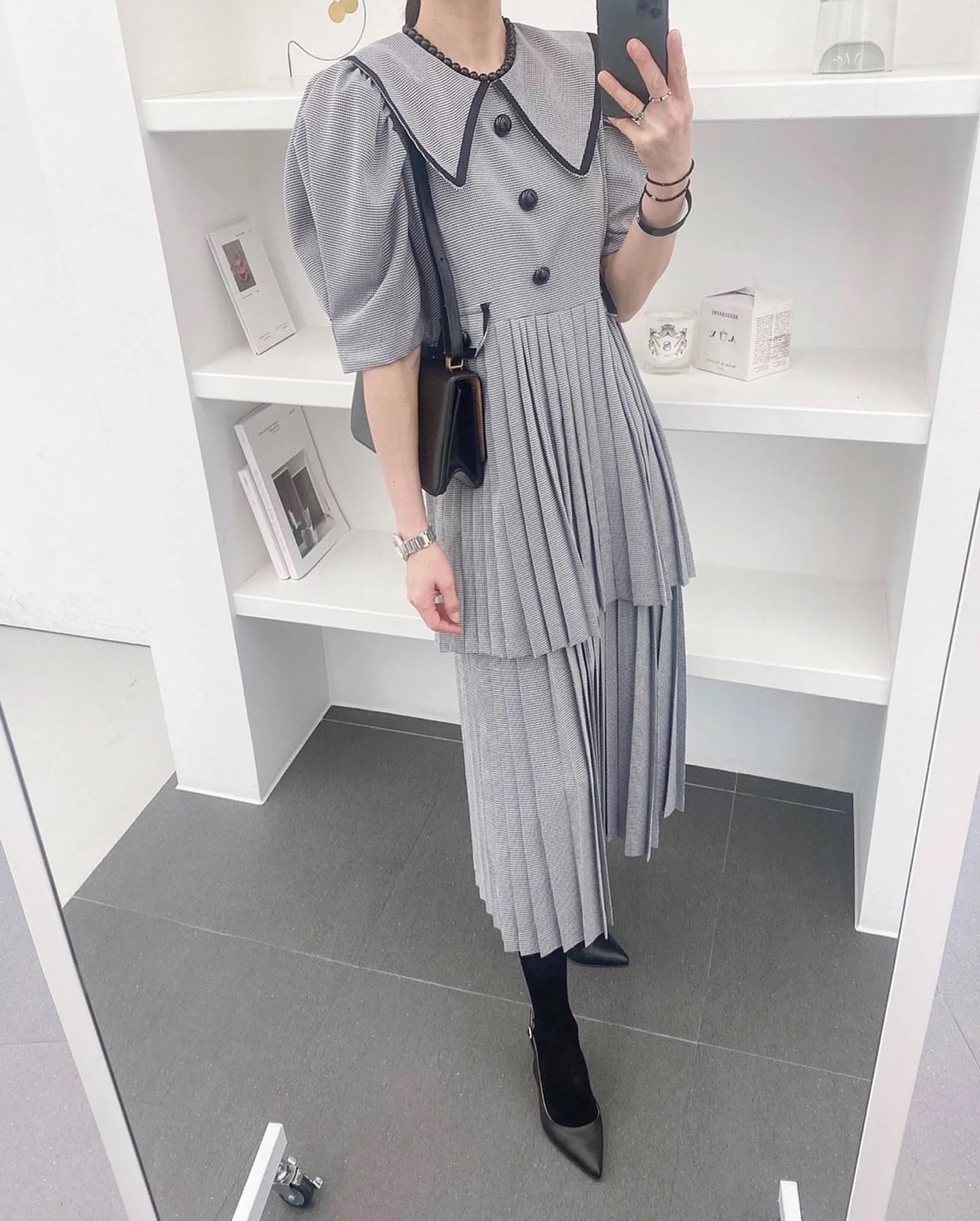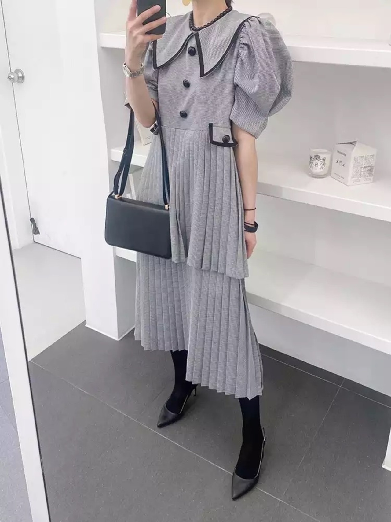 配色の襟元や、パフスリーブ、プリーツスカートがデザインされたワンピース。