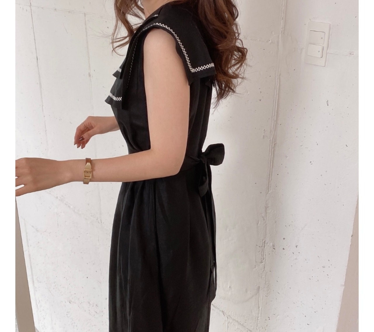 アシンメトリーのセーラーカラーがデザインされたワンピース。