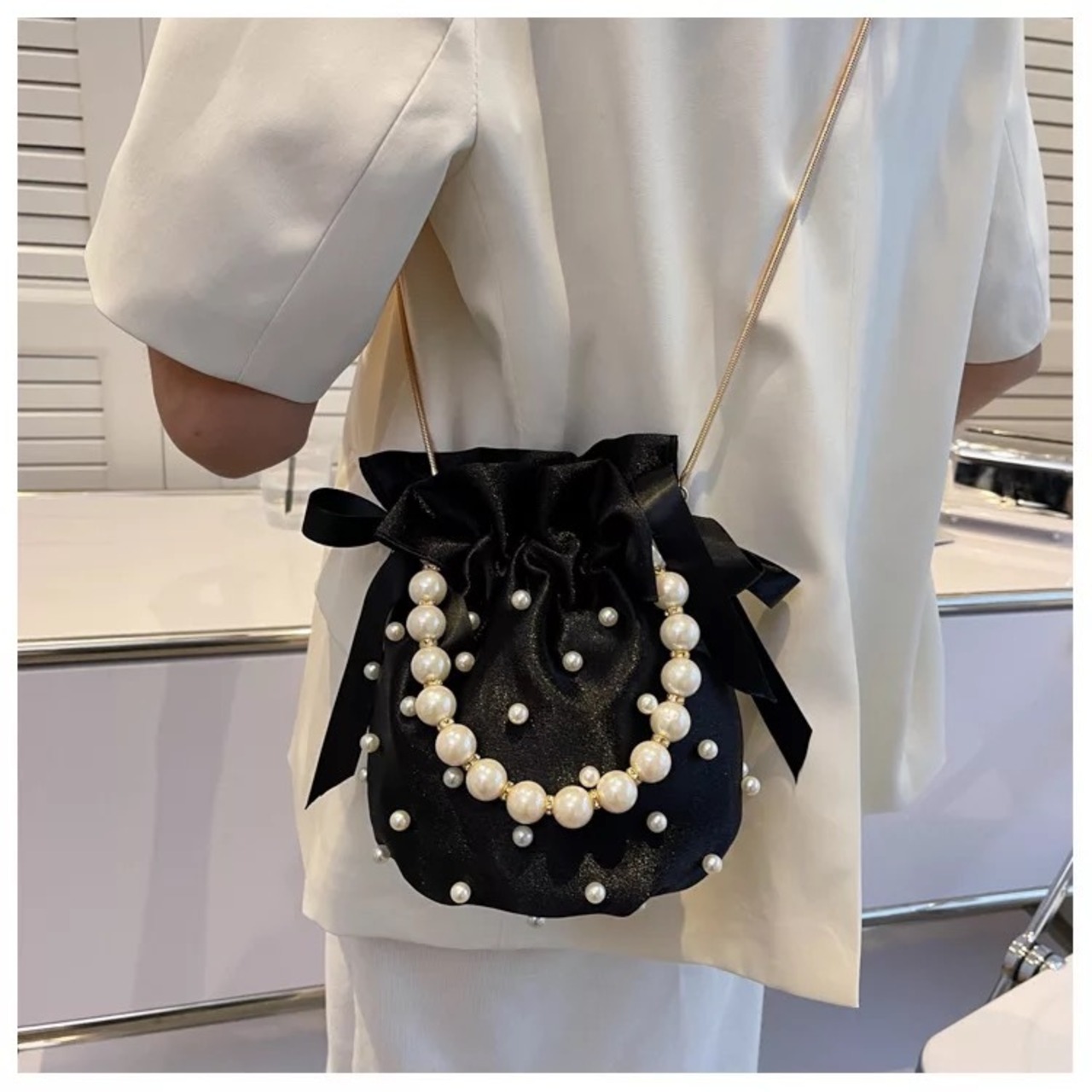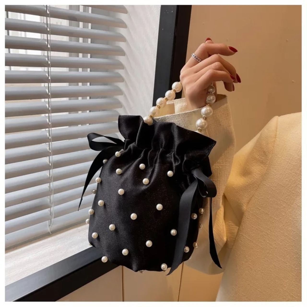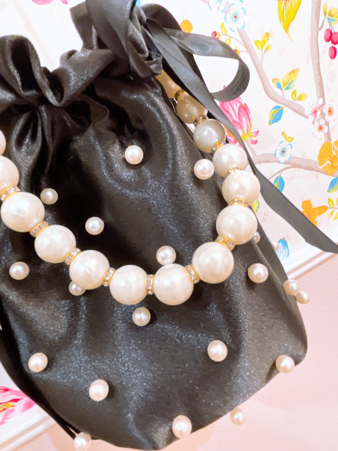 ドットパールにパールのハンドルが華やかなバッグ。